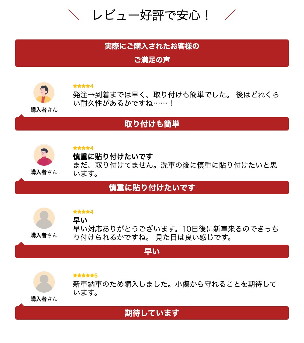 商品説明テープによる塗装への影響ゼロ、マグネット式ドアハンドルプロテクター。いつの間にか付いてしまうドアハンドル内側の引っかき傷から守ります。||磁力で車体に張り付くマグネット式なので塗装への影響無し。両面テープの様に剥がす際に気を使うこと無く、簡単に着脱できます。||ワックスやコーティングをした上からでも取り付けられるのでプロテクターとの間にワックスが残ったり、コーティング時に剥がす必要がありません。||素材そのものに色やパターンがついているため、塗装やメッキと違い色が変色することが無く長くご愛用いただけます。商品内容■ セット内容||・ フロント用×2 ||・ リア用×2 ||■カラー:4色展開||・カーボン調/ブラック ||・カーボン調/ホワイト ||・ブラック ||・ホワイト商品詳細■ 適合車種 : ノア90系 ||■ 年式 : R4.1- ||■ グレード : 全グレード対応 ||■ 材質 : PVC(表面)、マグネット、シリコンコーティング(車体側)||■ フロントドア用サイズ : 幅9.1cm×高さ9.1cm×厚さ0.1cm ||■ フロントドア用重さ : 20g(1枚) ||■ リアドア用サイズ : 幅10cm×高さ10cm×厚さ0.1cm ||■ リアドア用重さ : 18g■本製品はメーカー純正品ではありません。||■取り付ける際はドライヤー等で軽く温めて柔らかくし、ドアに押し付ける形で取り付けてください。||■温めすぎると変色の原因となりますのでご注意ください。||■ドライヤー使用時は軍手等を着用し、やけどにご注意ください。||■分解、改造、その他想定外の使用による事故及び損害に関しては保証いたしません。||■取り付け、交換、その他不明や不安な点がある場合はお近くの専門店様にご相談、ご確認ください。||■加工後の返品、交換には応じられません。||■本製品のご使用は自己責任でお願い致します。注意事項■輸入品につき傷やスレなどがある場合がございます。ご了承下さい。■本ウェブサイトに掲載されている商品の色と実際の商品の色とは、ご使用されるモニターまたはモニターの設定の違い等により、相違がある場合があります。保証の有無■初期不良・7日以内の不良に関しましては100%対応致します。■7日以降の保証期間につきましては商品毎に異なりますのでご確認ください。■お客様都合での返品につきましては送料、その他手数料のご負担をお願いします。関連商品シエンタ 10系 MXP 新型 2022 ドアプロテクター 4枚入 マ...ノア 90系 ドアプロテクター 4枚入 マグネット ドアガード ドアハ...日産 ノート e13 ドアプロテクター 4枚入 マグネット ドアガード...1,980円1,980円1,980円ステップワゴン ステップワゴンスパーダ RK RP ドアプロテクター ...スズキ ハスラー MR52S MR92S ドアプロテクター 4枚入 マ...カローラクロス ドアプロテクター 4枚入 マグネット ドアガード ドア...1,980円1,980円1,980円ホンダ N-BOXカスタム N-BOXプラス JF3 JF4 ドアプロ...ホンダ ZR-V ドアプロテクター 4枚入 マグネット ドアガード ド...ヴォクシー ノア エスクァイア 70系 80系 ドアプロテクター 4枚...1,980円1,980円1,980円