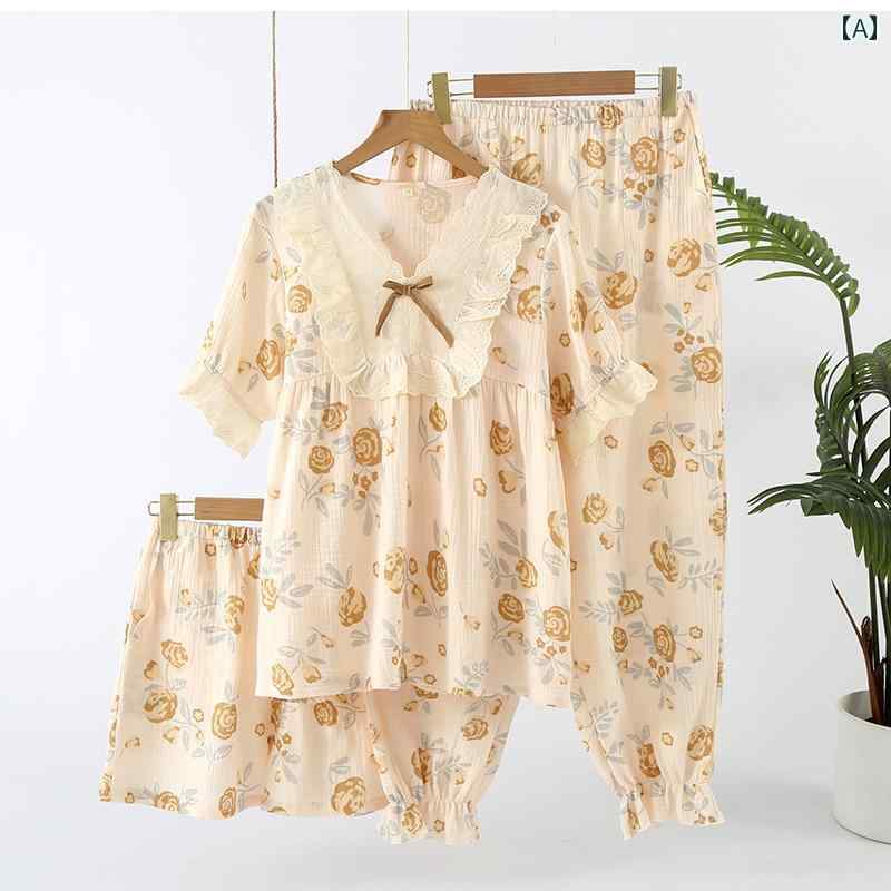 ガーゼ パジャマ レディース 夏 綿 半袖 プルオーバー Vネック トップス 長ズボン ショートパンツ 3点セット ポケット ウエストゴム リボン レース フリル 薄手 通気 かわいい 花柄 ローズ