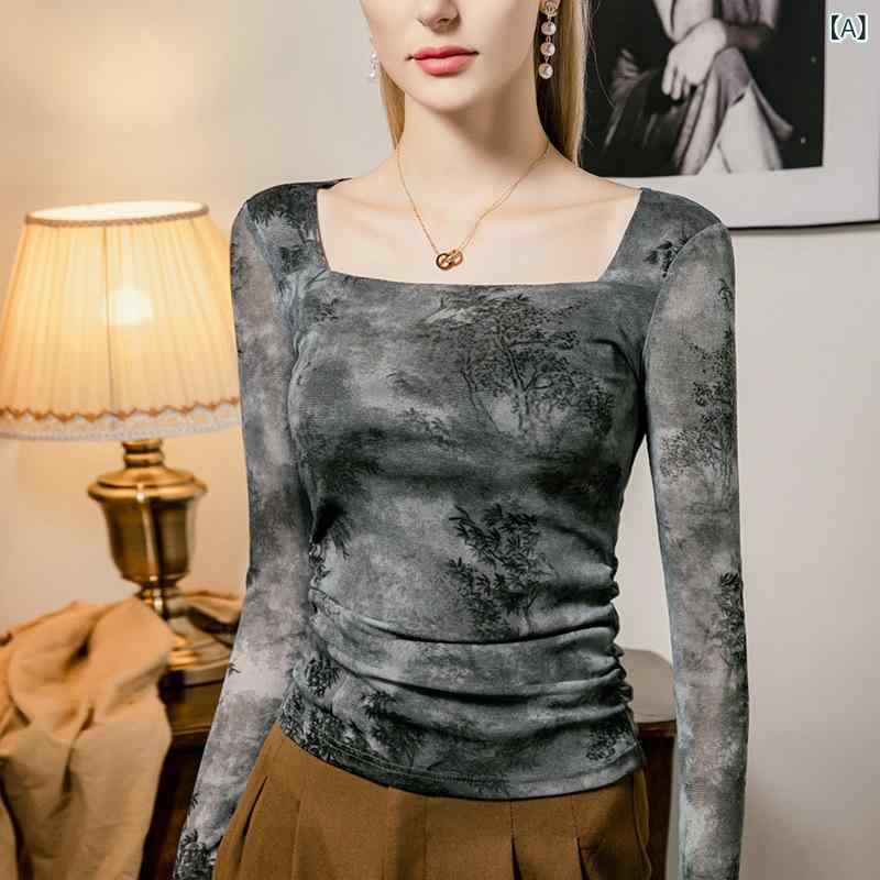 トップス レディース スクエアネック レトロ 花柄 メッシュ プリーツ 長袖 シアー カットソー プルオーバー 上品 きれいめ スリムフィット ナイロン カジュアル(x2)
