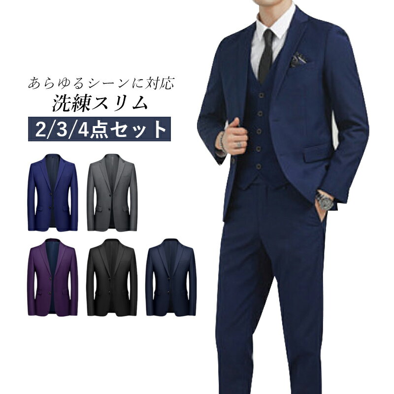 スーツ メンズ 韓国風 スリムフィット シングルブレスト 2つボタン ノッチドラペル センターベント 2点セット 新郎 衣装 ビジネス フォーマル カジュアル オールシーズン対応