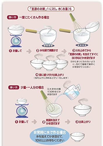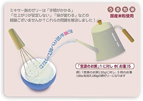 商品の説明 ◆かんたんにできる かいご食 かんたん!すぐできる! ●お粥を炊く手間がいりません ●お粥をミキサーにかける必要がありません ●お湯を加えて混ぜるだけ ●誰でもすぐに粥ゼリーが作れます ●おいしくて、しかも毎日食べても飽きのこない味にこだわりました 食べやすい! ●でんぷん分解酵素を使っていませんのでお米本来の風味を変えません ●ベタツキを抑え、なめらかな食感を実現しました おいしい! ●「宮源のお粥」専用のゲル化(固形化)剤をブレンドしておりますので、お湯の加減で、かたさや食べやすさを自由に調節することができます 原材料・成分 うるち米粉(国産)、デキストリン /ゲル化剤(増粘多糖類)、(一部に小麦を含む) ご注意(免責)>必ずお読みください 【調理上の注意】 ●本製品をお湯に溶かした際に大きなかたまりができた場合は取り除いてください。 ●お湯が沸騰している中に本製品を加えると大きなかたまりができることがあります。 必ずコンロの火を切ってから本製品を加えてください。 ●熱湯を使用する場合は「やけど」などに十分ご注意ください。 ●器に移した粥ゼリーをむやみにかき混ぜないでください。 ●本製品は70℃以下のお湯の場合、本来の粥ゼリーにならないことがあります。 その場合は鍋や電子レンジ(低温設定)で再加熱してください。 ●本製品にだし汁や塩分濃度の高い汁物を加えた場合は、十分にゼリー化しないことがあります。 ●ミキサーの使用前後の洗浄及び殺菌など、衛生管理を充分に行ってください。 ●まれに黒褐色の小片が見られることがありますが、米粉の焼粉ですのでご心配ありません。