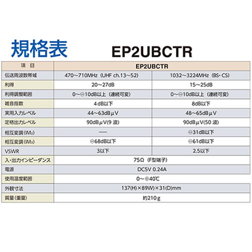UHF・BS・CS テレビレコーダーブースター 4K8K 3224MHz 2出力 EP2UBCTR マスプロ電工【4K・8K対応】【屋内用・卓上型 】