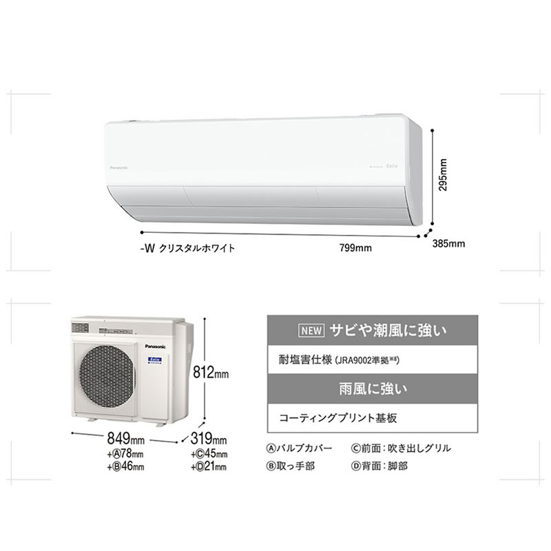 ※ご注意ください!※こちらの商品は特大サイズになりますため、恐れ入りますが、荷降ろしからお客様のお手伝いが必要となります。予めご理解、ご了承の上ご注文下さい。 ◆代引きでのお支払いと、日時指定はお受けすることができません。◆受け取り場所は玄関先までとなります。(※屋内搬入はできません)◆商品受領時は必ず外箱に破損がないかご確認ください。◆エレベーター無しの2F以上のご自宅へはお届けできません。◆北海道・沖縄や、離島・山間部他、一部地域への配送はお受けすることができません。◆送料無料であっても地域によっては追加料金が発生する場合がございます。ナノイーX搭載、換気・加湿+極上な冷暖房を実現するプレミアムモデル◆冷暖房だけでなく「換気」「加湿」もできるエアコン ・ナノイーXに合わせて給排気換気で空気をキレイに ・給水レス加湿で暖房しながらお部屋のうるおいキープ◆「エネチャージ極上冷暖房」でムダなく快適・省エネ ・「新・AI快適おまかせ」で快適温度へ自動でコントロール ・ムダをエネルギーに変えて省エネ&快適に (エネチャージ快湿制御・エコインバーター制御・サーキュレーションモード)◆「ナノイーX」でお部屋もエアコン内部も清潔 ・ナノイーXを生かしてお部屋の有害物質を抑制 (においケア+ねらって脱臭・クリーン冷暖) ・全自動お掃除&エアコン内部のカビ菌の「除菌」でキレイをキープ・電源:単相100V・室内機サイズ:295×799×385mm/質量14kg・室外機サイズ:812×849×319mm/質量48kg・暖房畳数のめやす:9~12畳(15~19m2 )能力(kW):4.2(0.3~7.1)消費電力(W):915(105~1980)低温暖房能力:5.6kW・冷房畳数のめやす:10~15畳(16~25m2)能力(kW):3.6(0.4~4.8)消費電力(W):825(110~1250)