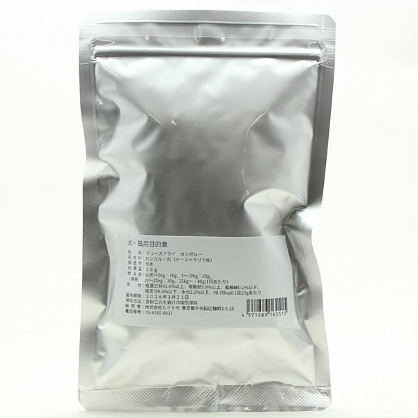 オーストラリア産の野生のカンガルーのみを使用抗生物質、残留農薬に汚染されていないクリーンミートです。※最短賞味期限表記についてタイトルに表示の賞味期限は、弊社在庫の最短期日になりますがご注文のタイミングにより表記より長い場合も御座います。◆輸入元入荷状況により表記より短くなる場合も御座います。◆賞味期限のご指定(期限の長い商品等)はお受け出来ませんので、予めご了承ください。この商品は「ヤマト運輸」「ゆうパック」のいずれかにて配送となります。※配送業者を指定のご希望は、ご購入金額に関わらず指定料200円(税込)にてお受けいたします。ご購入時の備考欄に上記いずれかのご希望の配送業者名をご記入ください。ルイトモ 素材100%フリーズドライシリーズフリーズドライの特徴●ビタミンなど栄養成分や風味の変化が少ない●常温で長期保存が可能●手軽に良質のタンパク質を摂ることができる●おやつやフードのトッピング、手作り食にも手軽に活用できる●手が汚れず、持ち運びに便利●風味や香りをそのまま閉じ込めているので、嗜好性が高いフリーズドライ カンガルー(野生)オーストラリア産の野生のカンガルーのみを使用抗生物質、残留農薬に汚染されていないクリーンミートです。不飽和脂肪酸の一種、※共役リノール酸を多く含みます。※共役リノール酸→血液中のコレステロールや脂肪を減らす効果が期待されます。高タンパク、低脂肪のヘルシーミートなのでダイエット中でも安心◎ご使用方法栄養素が自然の状態で封じ込められたフリーズドライは使い方色々です。簡単に手で割れるので、そのままオヤツやトッピングにしたり、手作り食の動物性蛋白源としてもOKです。保存方法が簡単で香りも良いので、トレーニング用のご褒美などにもお勧めです。原材料:カンガルー肉(オーストラリア産)原産国:日本成分:粗蛋白質 85.6%以上、粗脂肪 5.8%以上、粗繊維 0.1%以下、粗灰分 6.4%以下、水分 2.2%以下カロリー:98.75kcal/一袋25gあたり※最短賞味期限表記についてタイトルに表示の賞味期限は、弊社在庫の最短期日になりますがご注文のタイミングにより表記より長い場合も御座います。◆輸入元入荷状況により表記より短くなる場合も御座います。◆賞味期限のご指定(期限の長い商品等)はお受け出来ませんので、予めご了承ください。この商品は「ヤマト運輸」「ゆうパック」のいずれかにて配送となります。※配送業者を指定のご希望は、ご購入金額に関わらず指定料200円(税込)にてお受けいたします。ご購入時の備考欄に上記いずれかのご希望の配送業者名をご記入ください。