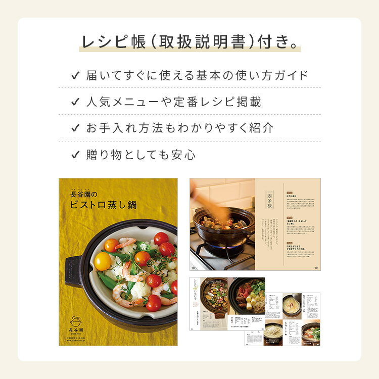 【お届け納期のご注意】 現在予約受付中2025年12月中旬以降 順次発送いたします ●ビストロ蒸し鍋の販売について ビストロ蒸し鍋につきまして、品切れの状態が多く大変ご迷惑をお掛けし申し訳ございません。 生産数量が限られており大変申し訳ございませんが、【一世帯 最大2点】までで数量を限定させていただきたく、お願い申し上げます。(複数回ご注文の場合、2回目以降はキャンセルとさせていただきます。)ご不便をお掛けし申し訳ございませんが、何卒ご了承のほどお願い申し上げます。数量限定のため品切れの場合はご容赦賜りますようお願い致します ◎ビストロ蒸し鍋 大16,500円(税込)/φ27×h16.5cm/1800㎖/3.5kg ビストロ蒸し鍋 小14,300円(税込)/φ23×h14.5cm/1200㎖/2kg ※空焚きできます。 付属品:蒸し鍋用トング・レシピ帳(取扱説明書) 「1つでいろいろ使える土鍋が欲しい」そんなお客さまの声から生まれた、蒸す・煮込む・ローストする・炒める・焼く……などなど、多機能に使える土鍋です。 アツアツの「鍋料理」はもちろん、普段の「煮込み料理」も。 「陶製すのこ」を使って「蒸し料理」など、ひとつあればいろいろな楽しみ方が。 一器多様な「ビストロ蒸し鍋」で、バラエティー豊かな食卓を。 【 伊賀の粗土で美味しく料理 】 伊賀の粗土の特性(多孔質)により蓄熱性が高く、また遠赤外線効果で食材の芯までしっかり熱が浸透し、美味しく料理が仕上がります。蓄熱力を活かし、火を止めた後の余熱調理で煮込み料理を。もちろん鍋料理にも! 【 陶製すのこを使って蒸し鍋に 】 付属の「陶製すのこ」を使えば蒸し鍋になります。伊賀土の遠赤外線効果と勢いのある蒸気が短時間で食材を蒸し上げます。食材の旨み・栄養素は逃がさず、余分な脂を落とします。 【 空焚きができる手頃なサイズでササッと調理 】 空焚きができるので、焼いたり炒めたりと幅広い調理に対応します。毎日ササッと使えるサイズなので、キッチンでも卓上でも大活躍! 「ビストロ蒸し鍋」のレシピ帳(取扱説明書)付き 初めて土鍋を使う場合や贈り物でも、安心してお使いいただけます。 レシピ帳はこちら 「ビストロ蒸し鍋」基本の蒸し料理の楽しみ方 (1)「ビストロ蒸し鍋」に半分程度の水(または湯)を入れます。 大サイズ:900㎖ 小サイズ:600㎖ (2)本体に「陶製すのこ」とふたをセットし、加熱します(業務用ハイカロリータイプの加熱器具の場合は中火で加熱してください)。 (3)ふたの穴から勢いよく蒸気が出るまで、十分に沸騰させてください。 ※必ず水(または湯)が沸騰してから食材を入れてください。 (4)ふたを開け、「陶製すのこ」の上に食材を入れます。再びふたをし、ふたの穴から勢いよく蒸気が出て(3の写真を参照)から1〜4分間で出来上がりです。 [ 食材を入れる時のPOINT ] ●蒸気の通りをよくするため、「陶製すのこ」の穴をふさがないように食材を盛りましょう。 例:きのこ類やもやしなどを下に敷く ●食感をお楽しみいただくために、一度に入れ過ぎず食べる分ずつ蒸しましょう。 ● 基本の楽しみ方は2600kcal/h:卓上カセットコンロの使用を目安にしています。 ● 食材や食材の厚み・量によって蒸し時間は変わります。肉厚の食材は蒸し時間を長くしてください。 ● 繰り返し食材を入れて卓上で蒸したてアツアツをお楽しみください。 ● ご使用中(直後)の「陶製すのこ」の上げ下ろしは、付属のトングを内側の穴に差し込んで行ってください。 ● ご使用中に水が少なくなったら、「陶製すのこ」をトングを使ってずらし、水(または湯)を補充してください。入れ過ぎにご注意ください。