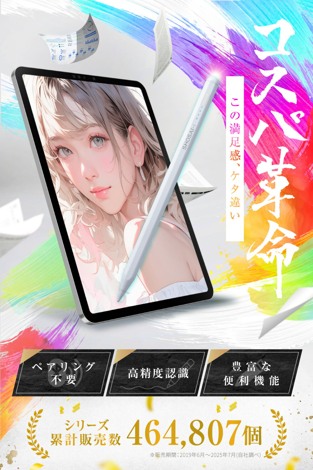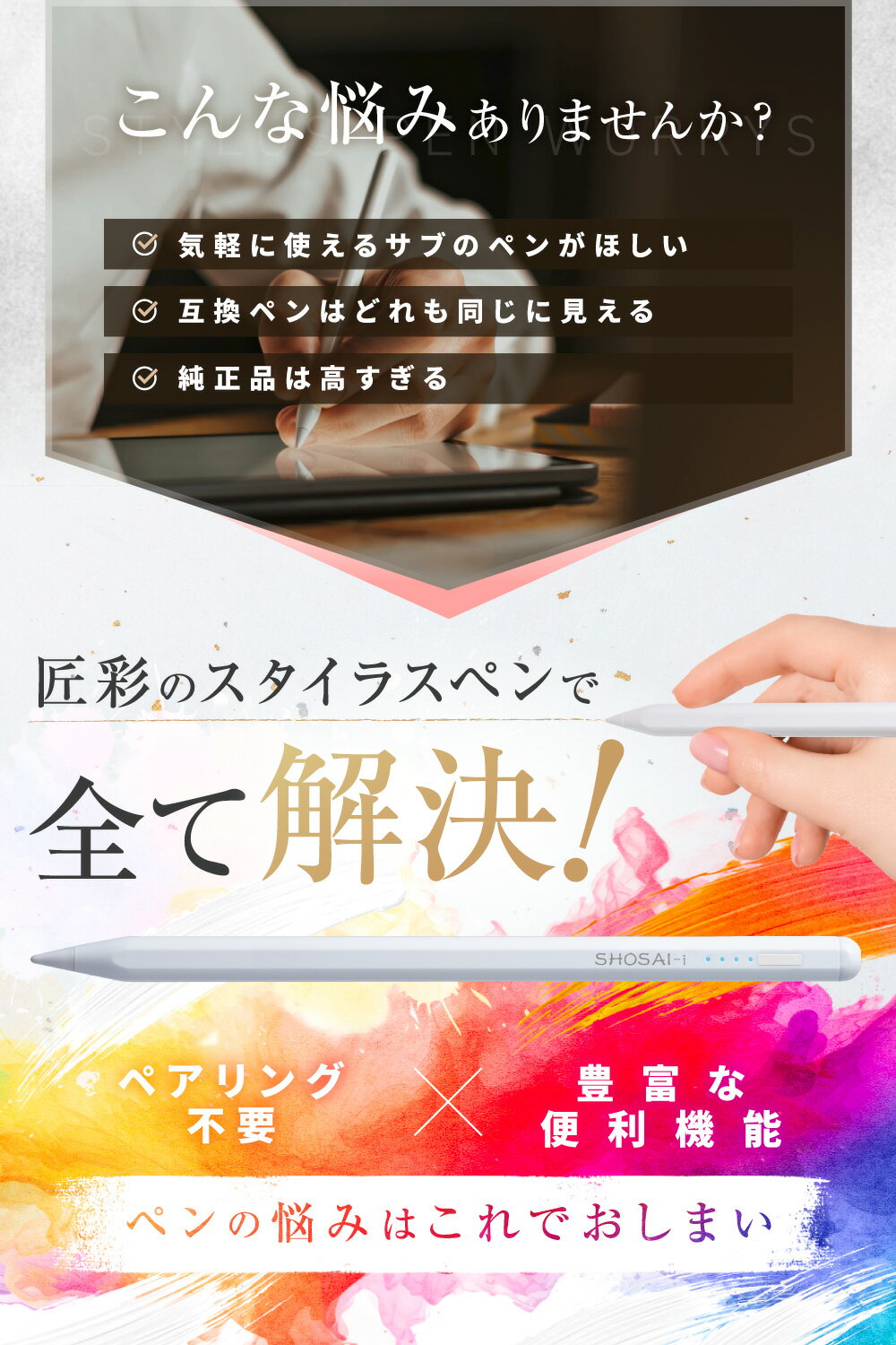 タイプiPad専用版 / スマホ・タブレット版同梱物充電ケーブル , 交換用ペン先対応機種【 iPad専用版 対応機種】 iPad 第11世代/10世代/9世代 Air 10.9 / 11 /13 、 Pro 11 / 12.9 /13mini 6 /7 など2018年以降発売のiPad 【 スマホ・タブレット版 対応機種】 iPhone / iPad / Android / スマホ ( スマートフォン ) など 静電容量方式 のタッチパネルに対応 ※専用ペンに依存する機種では動作しない可能性有特徴1【 Bluetooth 接続不要】 iPad と ブルートゥース 接続 による ペアリング は不要です。電源ON ですぐに使用する事ができます。特徴2【 D型形状と マグネット 磁気吸着】 純正ペンと同様の 細い D型形状で appleペンシル と遜色ない書き心地を実現。マグネットで あいぱっど 側面に収納可能なスタイラスペンです。特徴3【 パームリジェクション 】 iPad ペンシル として画面に手を置いて作業可能。 あいぱっど用タッチペン として、 イラスト や メモ ビジネス に使用できる ipadタッチペン です。※パームリジェクションはiPad専用版のみの機能です。特徴4【 傾き感知 USB-C 充電式 】 タブレット用タッチペン の 傾斜を検知し線の太さが変わります。 鉛筆のように描け 子供用タッチペン お絵描き用タッチペン として使用。 充電は有線 usb-c ※ 傾き検知はiPad専用版のみの機能です。