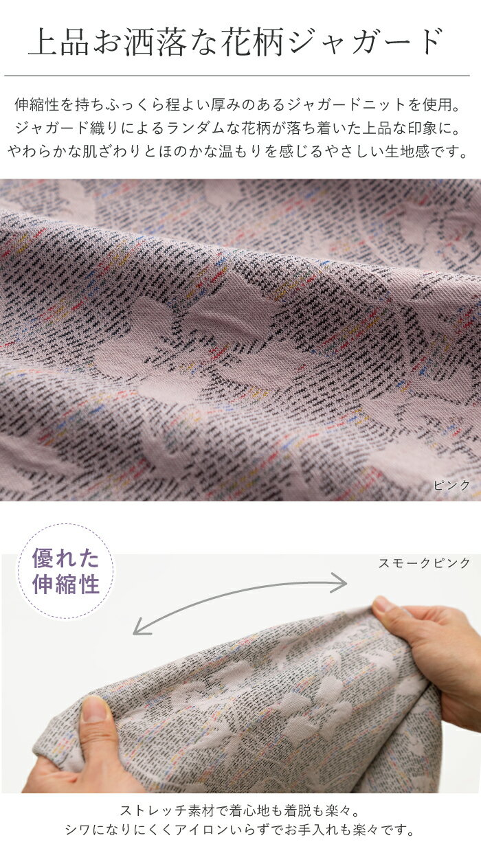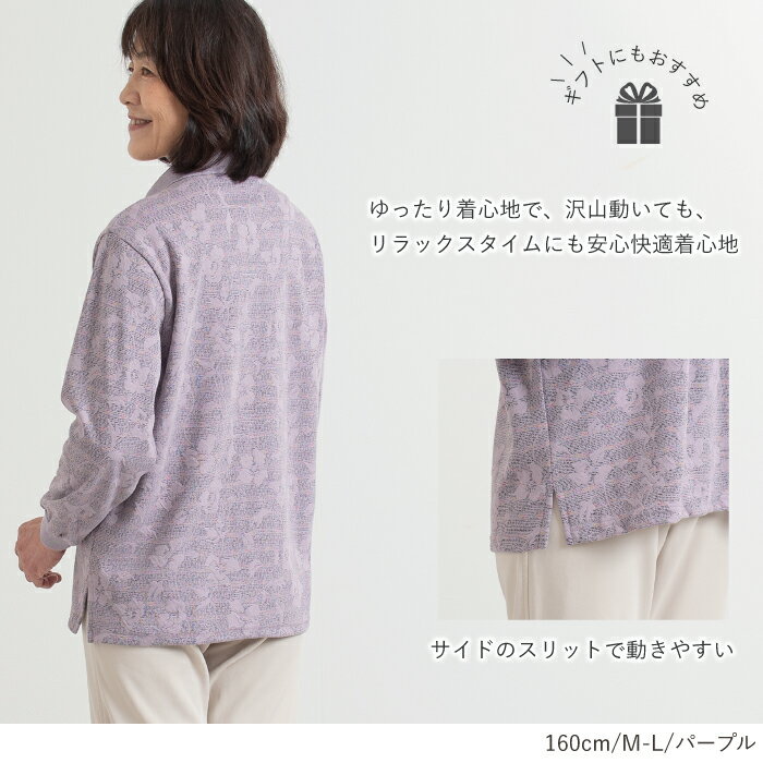 ■注意事項 ※実際の商品色にできるだけ近づけるよう撮影を行っておりますが、ご使用のモニターによって実際の明るさや色と多少異なって見える場合がございます。あらかじめご了承ください。 ※当店で販売中の商品は、複数店舗にて在庫を共有しているため、ご注文を頂きました場合でも、タイミングによりご注文の商品がご用意できない場合がございます。 その際は後日メールまたはお電話にてご連絡させて頂きます。 ◆検索されている関連キーワード 【POLO】【1PLSP】【3OTHERS】レディース ファッション ミセスファッション シニアファッション 50代 60代 70代 80代 女性 婦人服 服 プレゼント 誕生日プレゼント 誕生日 敬老の日 母の日 贈り物 ギフト 母 祖母 お母さん おばあちゃん 妻 お出かけ おしゃれ おしゃれ着 Nagominosato なごみのさと ナゴミノサト なごみの里 あす楽 即日発送 翌日配達 着替え 花柄 無地 パープル ブルー ピンク ポロシャツ 体型カバー 60代 70代 80代 シニア ファッション 高齢者 介護 おばあちゃん 施設 母の日 敬老の日 プレゼント 前當 前開き やわらか 快適 大きめ ゆったり 春 夏 秋 冷え 冷え取り あたたか 施設◆商品説明 伸縮性を持ちふっくら程よい厚みのあるジャガードニットを使用。 ジャガード織りによるランダムな花柄が落ち着いた上品な印象に。やわらかな肌ざわりとほのかな温もりを感じるやさしい生地感です。ご家庭で手軽に洗えるお手入れの楽さもポイント。 "肩回りにゆとりを持たせ腕も通しやすく、着脱も楽な仕様に。シワになりにくく軽やかな生地感で、ご家庭でのお手入れも楽に行えます。 袖口はリブで防寒対策にも、家事などの作業時や食事の際にも便利な仕様になっています。背中の丸いラインにやさしく沿うよう設計し、動きやすく、リラックスできる安心の着心地です。" 商品サイズ (cm)着丈バスト肩幅袖丈 S58944050 M-L601004250 LL621044350 ※商品タグには「ヌード寸法(該当のサイズに適した体の寸法の目安)を表記しています。サイズ計測方法はこちら 商品スペック ■素材柄部分:ポリエステル82%、綿17%、ポリウレタン1%衿袖部分:アクリル100% ■仕様・前ボタン3つ ・袖口リブ ■お手入れ手洗い可※詳しくは商品に付いている洗濯表示をご覧ください ■伸縮性・裏地あり ■透け感なし ■生産日本製 2