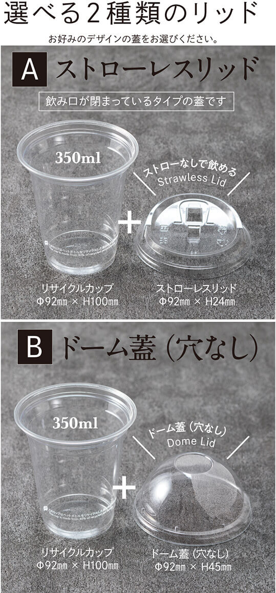 ●リサイクル クリアカップ サイズ:直径9.2cm×高さ10cm 容量: 350cc 数量:50個 素材:PET ●リサイクル ストローレスリッド サイズ:直径9.2cm×高さ2.4cm 数量:50個 素材:PET ●リサイクル ドーム蓋(穴なし) サイズ:直径9.2cm×高さ4.5cm 数量:50個 素材:PETペットボトルをリサイクルした原料を40%使用したリサイクルカップです。 ストロー不要で、フタをしたまま飲めるリサイクル ストローレスリッド、 リサイクル ドーム蓋(穴なし)の2種類の蓋をご用意しました。 お好みのタイプをお選びください。 ロゴシールを作成希望の方はこちら