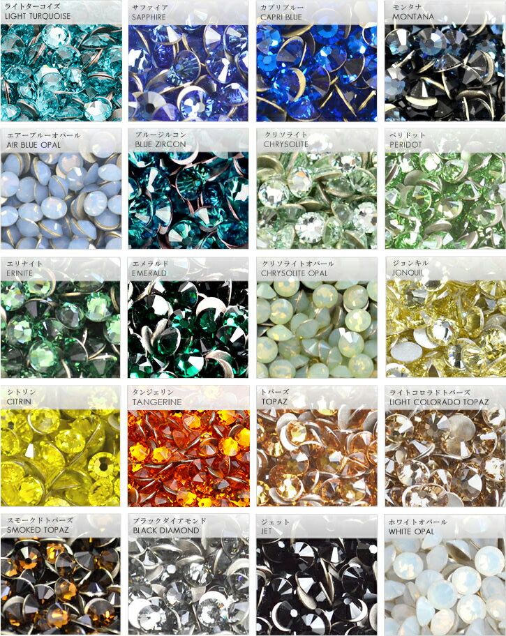本商品はご注文タイミングやご注文内容によっては、購入履歴からのご注文キャンセル、修正を受け付けることができない場合がございます。 特徴 スワロフスキー ラインストーン ヴェルサイユ宮殿や、オペラ劇場のシャンデリア等を手掛ける、SWAROVSKI社製のクリスタルラインストーン。通常のクリスタルに比べ、酸化鉛が最低32%と多くなっている為、光の反射加減により、虹色に見える事があります。 長い歴史に培われた、高品質の輝きをお試しください。 カラー 厳選 定番の20カラー ライトターコイズ/サファイア/カプリブルー/エアーブルーオパール/ブルージルコン/クリソライト/ペリドット/エリナイト/エメラルド/クリソライトオパール/ジョンキル/シトリン/タンジェリン/トパーズ/ライトコロラドトパーズ/スモークドトパーズ/ブラックダイアモンド/ジェット/ホワイトオパール/ サイズ ss5(1.7mm〜1.9mm) /ss7(2.1mm〜2.3mm)/ss9 (2.5mm〜2.7mm)/ss12 (3.0mm〜3.2mm)/ss16 (3.8mm〜4.0mm) 入数 ss5(100粒) / ss7(100粒) / ss9(100粒) / ss12(80粒) / ss16(60粒) ネコポス OK その他注意事項 お使いのブラウザや、画面設定により商品のカラーが異なって見える場合がございます。 同サイズ・同カラー大量注文で、特に指定がない場合、パッケージでの発送をする場合がございます。 ■ネコポスをご利用の場合のご注意■ ・ネコポスは手渡しではなく、ポストへ直接投函となります。 その為、代金引換や日時指定は出来ません。 追跡サービス有り。 ・ 配達時の欠損・盗難・不達・延着など保証がございません。 詳しくは配送についてをご確認の上ご利用くださいますようお願い申し上げます。極小サイズSS3はコチラ ▼ その他カラーはコチラから ▼ 暖色系20色 クリスタルAB(オーロラ) ターコイズカラー ジェットヘマタイト クリスタルキャル オーラムゴールド ▼ お得なスワロセットはコチラから ▼ 5サイズセット 定番20カラーセット