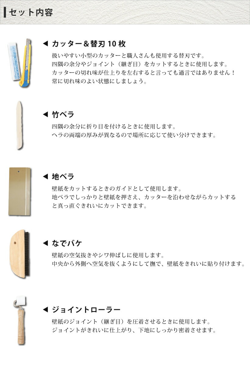 セット内容 カッター、替刃10枚、竹ベラ、地ベラ、なでバケ、ジョイントローラー 送料について こちらの商品は送料別です。 ※北海道は別途送料となります。ご注文頂いた時点でご連絡させていただきます。 返品・交換について お客様都合による返品・交換は承ることができません。 不良品につきましては商品到着後7日以内にご連絡ください。当店にて不良箇所を確認させて頂いた後、良品と交換させて頂きますので、不良品は捨てずに保管してください。 備 考 道具は一部仕様が変更になる場合がございます。予めご了承下さい。
