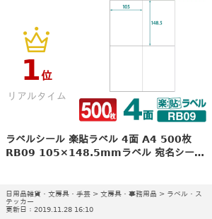 宛名ラベルや各種表示ラベルの作成に便利! 工場直販のラベルシールです。 ■商品情報 商品名 楽貼ラベル 4面 用紙サイズ A4 シート枚数 500枚/箱 ラベルサイズ 105×148.5mm ラベル枚数 2000枚 坪量 147g/m2 紙厚 0.14mm ISO白色度 90% 対応プリンター マルチ対応 (インクジェットプリンター/レーザープリンター/コピー機) お問い合せNo. RB09 ■他社製ラベルシール 同型品 A-oneエーワン 31312 31545 31546 72204 nana東洋印刷 WP00401 C4i C4iA C4iF CLT-4 ※この対応表は型レイアウトが同じものをまとめたものです。 ■楽貼ラベル ラインナップ 500枚入がお買い得♪ 面付 ラベルサイズ 入数 1面210×297100枚入 500枚入 2面210×148.5100枚入 500枚入 4面105×148.5100枚入 500枚入 8面105×74.25100枚入 500枚入 10面86.4×50.8100枚入 500枚入 12面四辺余白付86.4×42.3100枚入 500枚入 12面四辺余白付・角丸83.8×42.3100枚入 500枚入 18面70×42.3100枚入 500枚入 20面42×74.25100枚入 500枚入 21面70×42.3100枚入 500枚入 21面上下余白付70×38.1100枚入 500枚入 24面上下余白付70×33.9100枚入 500枚入 24面四辺余白付66×33.9100枚入 500枚入 44面48.3×25.4100枚入 500枚入 65面38.1×21.2100枚入 500枚入 ラベル ラベルシール ラベル用紙 シール用紙 宛名ラベル 宛名シール OAラベル マルチラベル 汎用ラベル マルチプリンタラベル PCラベル プリンターラベル ラベルシート 紙ラベル 特価ラベル コピー機用 プリンター用