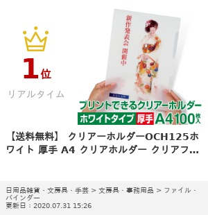 プリンターで印刷できるクリアーホルダー。 自作イラストや思い出の写真などを入れたオリジナルのクリアーホルダーを1枚から作成できます。 厚みのあるフィルムを使用した厚手タイプ。しっかりとした質感です。 ホワイトは、半透明の内側に白印刷を施したもので、素材や印字適性は同等です。 人物写真で肌色の再現などを求める場合にはホワイト、透け具合を活かしてデザインする場合には半透明など、ご利用になる用途に合わせてお選びください。 商品名: クリアーホルダーOCH125ホワイト 厚手 A4 サイズ:220×312mm (A4サイズ用) 入り数:100枚 素材:PET素材 ※基材となるフィルム1枚の厚みが125μmの厚手タイプです。 対応プリンター:「対象機種/設定方法およびご注意事項」をご参照ください対象機種/設定方法およびご注意事項 (A4) 以下のプリンターにて検証を行っていますが、当社にて保証するものではありません。ご使用にあたっては、実際に出力される画像にて事前にお試しください。 ※プリンターやサーバーの設定方法につきましては、お使いの機種のマニュアル等をご確認ください。※下記以外のプリンター、複合機などでの検証は行っていません。 ■ 富士フイルムビジネスイノベーション社製プリンター 機種 給紙トレイ 最大セット枚数 セット面 紙質モード Color 1000/800 Press Tray1 30枚 印字面を上 普通紙コート 透明 300g/m2転写電圧150%を目安に変更※ VersantTM 3100/2100/180/80 Press 手差しトレイ 30枚 印字面を上 タックフィルム転写電圧120%を目安に変更※ IridesseTM Production Press 大容量 トレイ 30枚 印字面を上 普通紙 コート 透明 300g/m2 LEF限定 閉じている(ミシン目)側がトレイ手前、右側になるようにセット。 エアアシスト調整を「ミスフィード対応に」。 像密度が累積で70%以上になると光沢ムラが発生する場合があります。 転写不良が発生する場合は、転写出力調整140%で良化します。 Color C75 Press 手差しトレイ 30枚 印字面を上 非コート紙 257〜300g/m2転写電圧300%を目安に変更※ 700 Digital Color PressDocuColor 7171 PDocuColor 5656 PDocuColor 5151 P 手差しトレイ 30枚 印字面を上 非コート紙 220〜300g/m2転写電圧150%を目安に変更※ DocuColor 1450GA 手差しトレイ 30枚 印字面を上 非コート紙 257〜300g/m2転写電圧200%を目安に変更※ DocuCentre-VII/ApeosPort-VII C7773/C6673/ C5573/C4473/C3373/C3372/C2273 手差しトレイ 1枚ずつセット1枚ずつ 取出し 印字面を下 厚紙2 転写電圧8〜10を目安に変更※ フィニッシャーA2*装着時には、サイドトレイ*が必要です。フィニッシャーB3*およびC3*を装着時に、プリンタードライバから出力指示をかける場合は、排出方法=【指定しない】を推奨します。*フィニッシャーA2、B3、C3およびサイドトレイはオプションです。 DocuCentre-VI/ApeosPort-VIC7771/C6671/C5571/C4471/C3371/C2271 手差しトレイ 1枚ずつセット1枚ずつ 取出し 印字面を下 厚紙2 転写電圧8〜10を目安に変更※ フィニッシャーA2*装着時には、サイドトレイ*が必要です。フィニッシャーB1*およびC3*を装着時に、プリンタードライバから出力指示をかける場合は、排出方法=【指定しない】を推奨します。*フィニッシャーA2、B1、C3およびサイドトレイはオプションです。 DocuCentre-V/ApeosPort-VC7785/C6685/C5585DocuCentre-IV/ApeosPort-IVC7780/C6680/C5580 手差しトレイ 30枚 印字面を上 厚紙3またはコート紙3転写電圧150〜250%を目安に変更※ DocuCentre-V/ApeosPort-VC7776/C6676/C5576/C4476/C3376/C2276C7775/C6675/C5575/C4475/C3375/C2275/DocuCentre-IV/ApeosPort-IVC5575/C4475/C3375/C2275 手差しトレイ 30枚 印字面を下 厚紙2またはコート紙2転写電圧6〜8を目安に変更※ DocuPrintC4000d/C5000d/C4150d/C5150d 手差しトレイ 30枚 印字面を下 厚紙2またはコート紙2転写電圧10〜16を目安に変更※ ※画像、出力環境により異なります。 ■ コニカミノルタ社製プリンター 機種 給紙トレイ(手差しトレイまたは大容量トレイの最下段トレイ) 用紙種類/坪量 排紙方法 出力紙濃度調整 bizhub PRESSC1100/C1085/C71hc/C1070/C1070P/C1060 【大容量トレイの場合】「重送検知設定」をOFF「機械状態」→「用紙設定」→「対象トレイ」→「設定変更」→「プロセス調整」→「次頁」×2回 →「重送検知」→OFF※使用後は必ずONに戻してください。 塗工紙MO217〜256g/m2 フェイスアップ OFF bizhub PRESSC7000/C7000P/C6000/C70hc 【大容量トレイの場合】「重送検知設定」をOFF「設定メニュー/カウンター」ボタン→管理者設定→共通設定→次頁×3回→「重送JAM検知」OFF※使用後は必ずONに戻してください。 塗工紙MO210〜256g/m2 AccuriopressC6100/6085C3080/3070/83hc 【大容量トレイの場合】「重送検知設定」をOFF「機械状態」→「用紙設定」→「対象トレイ」→「設定変更」→「エキスパート調整」→「次頁」×2回 →「重送検知」→OFF※使用後は必ずONに戻してください。※封筒ユニット装着を推奨としております。 塗工紙MO217〜256g/m2 bizhubC360/C280/C364/C364eC754e(759)/C554e/C368 /C287 手差しトレイ※1枚ずつ給紙してください。 厚紙3 - - オンデマンドクリアーホルダー A4 取扱説明書(PDF) クリアーホルダーOCH125(半透明/ホワイト)取扱説明書(PDF)