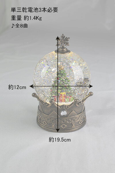 品名 スノーイングミュージックスタンド(スノードーム) 原材料名 アクリル・レジンその他 商品サイズ・仕様 高さ:約19.5cm 横幅:約12cm 奥行:約12.cm 重量:約1,400g 全8曲入 ※スイッチONでライトが点灯し、キラキラとアメが舞い上がります。 (無音モードもあります。) 単三乾電池3本必要 市販のボタン電池をお買い求めください。 ※USB TypeAから電源が取れるアダプターコード付(約95cm) 商品特徴 ☆ぜったい欲しい定番のモチーフ クリスマスツリーと足元にプレゼントという、これぞクリスマスというモチーフのアイテムです。 それだからこそクリスマスには是非もの、ぜったい欲しいアイテムといえます。 スノードームという球体を王冠に乗せて、てっぺんにはスノーフレークを付けた、とても凝ったデザインです。 スイッチオンでライトアップしてキラキラしたラメが舞い、音楽を奏でます。 音楽だけオフにもできます。 また、USBプラグを使用していただくとも可能です。 (USBプラグは付属しています。) 注意点 写真のイメージと実物とは色合いなど、多少異なることがあります。 多少の色むら・キズ等がある場合もございますので、ご了承願います。 ウォーターボールの中は手作りで、多少の個体差がありますのでご了承願います。スノーイングミュージカルスタンド(スノードーム) ☆ぜったい欲しい定番のモチーフ クリスマスツリーと足元にプレゼントという、これぞクリスマスというモチーフのアイテムです。 それだからこそクリスマスには是非とも、ぜったい欲しいアイテムといえます。 スノードームという球体を王冠に乗せて、てっぺんにはスノーフレークを付けた、とても凝ったデザインです。 スイッチオンでライトアップしてキラキラしたラメが舞い、音楽を奏でます。 音楽だけオフにもできます。 また、USBプラグを使用していただくことも可能です。(USBプラグは付属しています。) 高さ:約19.5cm 横幅:約12cm 奥行:約12cm 重量:約1,400g 材質:レジン(樹脂)・アクリル・その他 全8曲入 ※スイッチONでライトが点灯し、キラキラとアメが舞い上がります。(無音モードもあります。) 単三乾電池3本必要(市販のボタン電池をお買い求めください。) ※USB TypeAから電源が取れるアダプターコード付(約95cm) ▼飾りつけ例 スノーイングミュージカルスタンド(スノードーム) 以外の商品はこのページの販売には含まれておりません。) 写真のイメージと実物とは色合いなど、多少異なることがあります。 多少の色むら・キズ等がある場合もございますので、ご了承願います。 ウォーターボールの中は手作りで、多少の個体差がありますのでご了承願います。