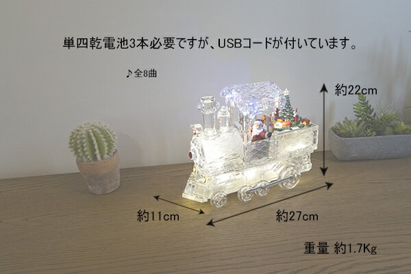 品名 LEDアクリルファンタジー(ミュージカルトレイン) 商品サイズ・仕様 高さ:約22cm 横幅:約27cm 奥行:約11cm 重量:約1,700g 全8曲入 単四電池3本必要 (電池は市販のものをお買い求めください) ※USB TypeAから電源が取れるアダプターコード付(約95cm) 商品特徴 ☆車輪も動く氷みたいな豪華な機関車 サンタさんが乗った透明の氷で作ったようなとても豪華な機関車です。 車体は内側からライティングされて、ボディとルーフでは色味が異なります。 車輪が実際にロコモーティブな動きをするのが特筆する部分です。(移動はしません) また後ろのクリスマスツリーはツリートップが輝き、下のアイテムがクリスマスツリーの周りを回転します。 曲は8曲です。 注意点 写真のイメージと実物とは色合いなど、多少異なることがあります。 多少の色むら・キズ等がある場合もございますので、ご了承願います。 手作りの部分が多くあり、多少個体差がございますので、ご了承願います。LEDアクリルファンタジー(ミュージカルトレイン) ☆車輪も動く氷みたいな豪華な機関車 サンタさんが乗った透明の氷で作ったようなとても豪華な機関車です。 車体は内側からライティングされて、ボディとルーフでは色味が異なります。 車輪が実際にロコモーティブな動きをするのが特筆する部分です。(移動はしません) また後ろのクリスマスツリーはツリートップが輝き、下のアイテムがクリスマスツリーの周りを回転します。 このシリーズでは最高に手の込んだ仕様となっております。 曲は8曲です。 高さ:約22cm 横幅:約27cm 奥行:約11cm 重量:約1,700g 全8曲入 単四乾電池3本必要 ※USB TypeAから電源が取れるアダプターコード付(約95cm) ▼飾りつけ例 LEDアクリルファンタジー(ミュージカルトレイン) 以外の商品はこのページの販売には含まれておりません。) 写真のイメージと実物とは色合いなど、多少異なることがあります。 多少の色むら・キズ等がある場合もございますので、ご了承願います。 手作りの部分が多くあり、多少の個体差がありますのでご了承願います。