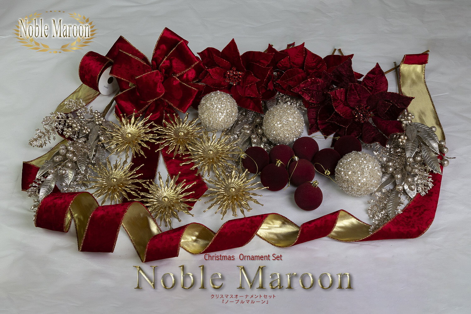品名 クリスマスオーナメントセット (ノーブルマルーン) 原材料名 ポリエステル・ポリエチレン・プラスチック・その他 商品サイズ・仕様 画像参照 商品特徴 ☆高品質なクリスマスカラー 濃い赤色(Maroon)とシックな金色のアイテムを組み合わせたオーナメントセットです。 Maroonのアイテムはリボンからボールに至るまでベロア調で格調高い雰囲気です。 ツリートップに飾るリボンはあらかじめ完成されたコンプリートタイプ。 また、ストレートのリボンと同じ材料で、しっかりとしており、裏側が金色のリバーシブルという 本当に珍しい素材を使用しています。 赤と金のオーナメントはクリスマスの定番。しかも上質なオーナメントを使用していますので、 間違いなく迷ったらコレではないでしょうか。 弊社オーナメントセットは、サンプルを一点一点手にとって、風合い、質感、個性、重量感などを考慮しています。 価格的にもホテルなどで使用される業務用クリスマスオーナメントの常識範囲での高級感を追求し、選定を行いました。 皆様、どうぞご鑑賞ください! ※この商品は、オーナメントセットで、ツリー・電球・ツリースカート等は含まれておりませんので、ご了承願います。 注意点 ・写真のイメージと実物とは色合いなど、多少異なることがあります。 ・ヒーターなど熱源には絶対近づけないようにしてください。熱により、変形したりする恐れがあります。また、収納時は日の当たらない涼しい所に保管してください。 ・グリッター(金粉・銀粉等)を使用しているパーツがあります。多少剥離しますので、あらかじめご了承ください。 ・写真はあくまでも飾り方例ですので、お客様のお好みにあわせてご自由に配置してください。 ・写真の飾り付けれは見えている部分だけ(半面)を飾っています。360度飾るには約2倍のオーナメントが必要となります。クリスマスオーナメントセット(ノーブルマルーン) ☆高品質なクリスマスカラー 濃い赤色(Maroon)とシックな金色のアイテムを組み合わせたオーナメントセットです。 Maroonのアイテムはリボンからボールに至るまでベロア調で格調高い雰囲気です。 ツリートップに飾るリボンはあらかじめ完成されたコンプリートタイプ。 また、ストレートのリボンと同じ材料で、しっかりとしており、裏側が金色のリバーシブルという 本当に珍しい素材を使用しています。 赤と金のオーナメントはクリスマスの定番。しかも上質なオーナメントを使用していますので、 間違いなく迷ったらコレではないでしょうか。 弊社オーナメントセットは、サンプルを一点一点手にとって、風合い、質感、個性、重量感などを考慮しています。 価格的にもホテルなどで使用される業務用クリスマスオーナメントの常識範囲での高級感を追求し、選定を行いました。 皆様、どうぞご鑑賞ください。 ※この商品は、オーナメントセットで、ツリー・電球・ツリースカート等は含まれておりませんので、ご了承願います。 ▼飾りつけ例 (ノーブルマルーン 以外の商品はこのページの販売には含まれておりません。) 品名: クリスマスオーナメントセット(ノーブルマルーン) 材質: ポリエステル・ポリエチレン・プラスチック・その他 飾り付け: 写真はあくまでも飾り方例ですので、お客様のお好みにあわせてご自由に配置してください。 ※写真の飾り付けれは見えている部分だけ(半面)を飾っています。360度飾るには約2倍のオーナメントが必要となります。 ★写真で使っているアイテム Ornament Set ノーブルマルーン Christmas Tree リアルツリー180cmノーザンアビエス ※別売 LED Light 200球LEDライト・コントローラー付(電球色) ※別売 Tree Skirt 100cmベロアツリースカート(ガーネットレッド) ※別売 ・写真のイメージと実物とは色合いなど、多少異なることがあります。 ・ヒーターなど熱源には絶対近づけないようにしてください。熱により、変形したりする恐れがあります。また、収納時は日の当たらない涼しい所に保管してください。 ・グリッター(金粉・銀粉等)を使用しているパーツがあります。多少剥離しますので、あらかじめご了承ください。 ・写真はあくまでも飾り方例ですので、お客様のお好みにあわせてご自由に配置してください。 ・写真の飾り付けれは見えている部分だけ(半面)を飾っています。360度飾るには約2倍のオーナメントが必要となります。