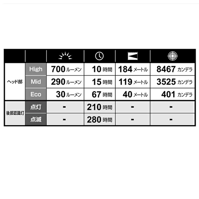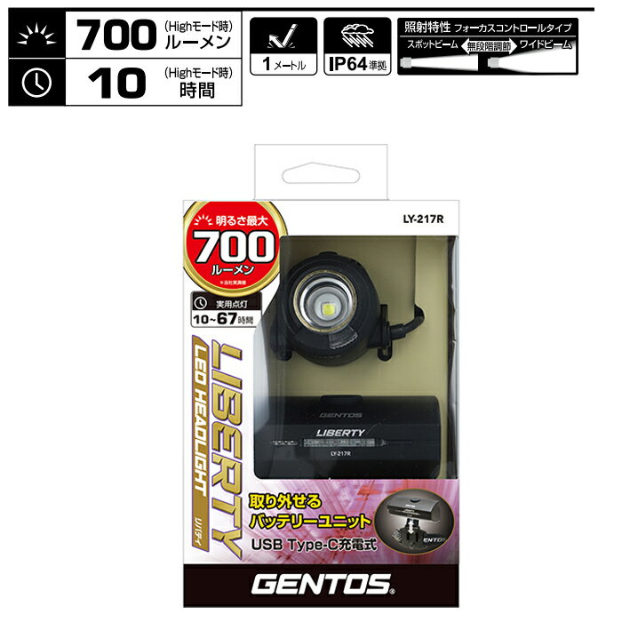 商品の仕様 ●サイズ:ヘッド部 約W70.0×H51.9×D55.9mm、電池ボックス部 約W103.6×H39.2×D40.5mm ●重量:約293g ●材質:ポリカーボネート ●明るさ:最大700ルーメン(Highモード時) ●点灯時間:High約10時間、Eco約67時間(ヘッド部) ●使用電池:専用リチウムイオン充電池 3.7V 4,500mAh内蔵 ●充電時間:約7時間 ●保護等級:耐塵・防滴仕様(IP64準拠) ●落下耐久:1m ● 特徴 ・USB Type-C充電式、バッテリーユニット着脱可能 ・フォーカスコントロールで照射範囲を無段階調整 ・後部認識灯搭載で安全性向上 ・45°可動式ヘッド GENTOS LIBERTYシリーズ LY-217R:夜間作業やアウトドアを強力にサポートGENTOS(ジェントス)のLIBERTYシリーズから、高機能充電式ヘッドライト「LY-217R」が登場。最大700ルーメンの明るさと、使いやすさを追求した多彩な機能を搭載し、あらゆるシーンであなたの視界を確保します。夜間の作業、登山、キャンプ、釣りなど、暗闇での活動に不可欠なパートナーとなるでしょう。商品の特徴・機能最大700ルーメンの明るさ: 高輝度チップタイプ白色LEDを搭載し、Highモードで最大700ルーメンの強力な光を照射。広範囲を明るく照らし、暗闇での視認性を飛躍的に向上させます。USB Type-C充電式&着脱式バッテリーユニット: 最新のUSB Type-Cポートを採用し、約7時間でフル充電が可能です。バッテリーユニットはヘッドライト本体から取り外せるため、ヘルメットなどに装着したままバッテリー単体での充電が可能。予備バッテリー(別売)があれば、長時間の使用も安心です。フォーカスコントロールシステム: レバーを操作するだけで、スポットビームからワイドビームまで、照射範囲を無段階に調節できます。遠方を照らすスポット照射から、手元を広く照らすワイド照射まで、状況に応じた最適な光を瞬時に得られます。後部認識灯搭載: 電池ボックス部に赤色の後部認識灯を搭載。点灯・点滅の切り替えが可能で、後方からの視認性を確保し、夜間の安全性向上に貢献します。インスタントオフスイッチ: 点灯後、一定時間経過後にスイッチを押すと、どのモードからでも1回の操作で消灯できる便利な機能です。45°可動式ヘッド: ヘッド部を上下45°まで角度調整できるため、見たい場所をピンポイントで照らすことができます。耐塵・防滴(IP64準拠)&1m落下耐久: 粉塵が内部に侵入しにくく、あらゆる方向からの水の飛沫による有害な影響がない防滴仕様。さらに1mの落下にも耐える堅牢設計で、過酷な環境下でも安心して使用できます。使用方法・注意事項ヘッドライトの操作は、ヘッド部と電池ボックス部にあるプッシュスイッチで行います。モードの切り替えはスイッチを押すたびにHigh→Mid→Eco→消灯の順で変化します。後部認識灯は点灯・点滅の切り替えが可能です。充電は付属のUSB Type-Cケーブルを使用し、充電中はチャージングインジケーターが赤点灯、充電完了で緑点灯します。【注意事項】光を直接目に当てないでください。本製品の充電池は交換できません。高温多湿、直射日光の当たる場所での保管は避けてください。強い衝撃を与えないでください。ブランド情報:GENTOS(ジェントス)GENTOSは、高性能なLEDライト製品を開発・製造する日本のブランドです。長年の経験と技術に基づき、プロフェッショナルから一般ユーザーまで、幅広いニーズに応える高品質なフラッシュライト、ヘッドライト、ワークライトなどを提供しています。信頼性と耐久性に優れたGENTOS製品は、多くのアウトドア愛好家や現場作業員から支持されています。商品仕様シリーズ名LIBERTYシリーズブランド名GENTOS (ジェントス)メーカー型番LY-217R原産国/製造国中国