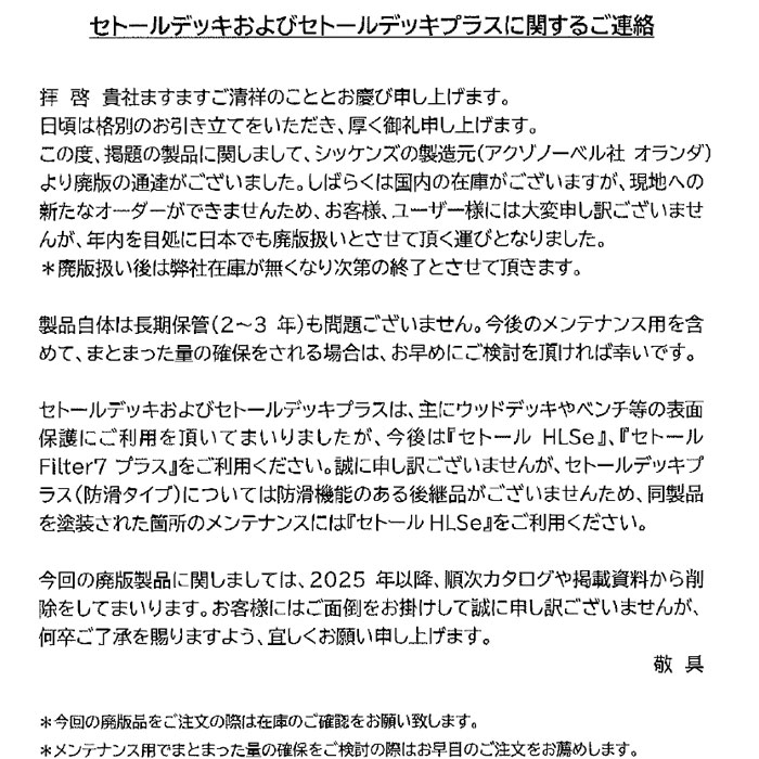 用途: 屋外木部:ウッドデッキ、ベンチ、遊具、ヨット木部(デッキ)など 特長: ●比較的厚めの塗膜を形成 ●家具調の美しい仕上がり感(中間光沢) ●抜群の紫外線抵抗性 ●耐摩耗性に優れる塗膜 その他 下塗りにはセトールHLSeを使用してください。 塗装用具:刷毛 用具の洗浄:塗料用シンナー 乾燥時間(塗装間隔):16時間以上 比重:0.88 塗装回数:2〜3回 標準塗布面積:約15平米/L/1回塗り 色数:1色(ナチュラル) 缶容量:1L、5L 注意事項 ●優れた耐候性を発揮させるため合計3回塗りをお薦めします。 ●色調や仕上がり感は樹種、塗装回数などにより異なります。