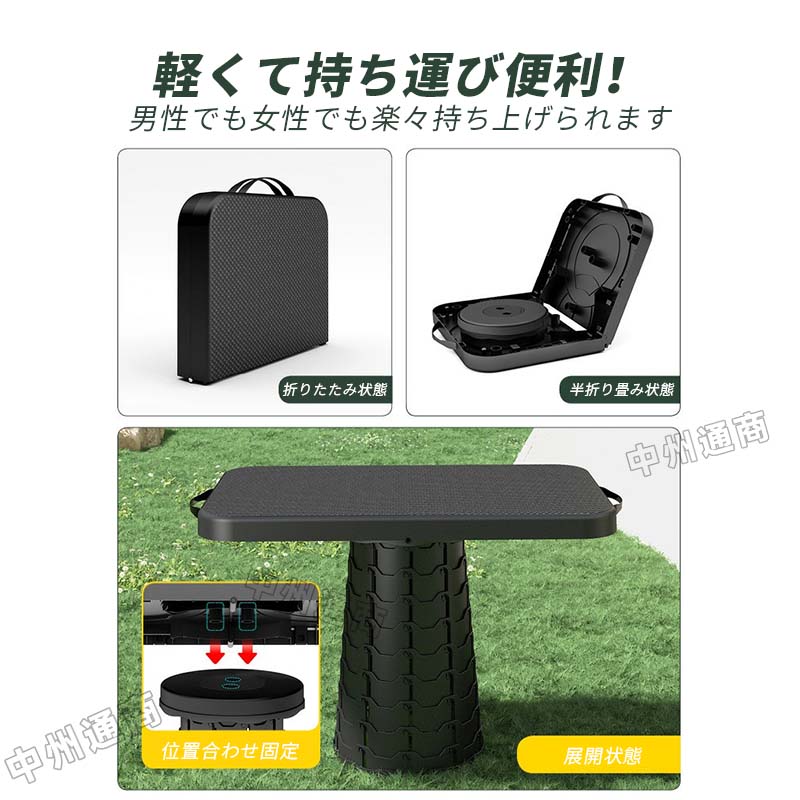 ●組み立てはとっても簡単! ●開いてロックするだけの簡単設置タイプなので女性一人でも気軽に組立てができます。 ●お好みや用途に合わせて使い分けることができる嬉しい仕様♪ ●天板中心部にはパラソル用ホールがあるので、ベランダやテラスでの使用にもおススメです♪ ●テーブルと椅子を収納することで、車のトランクに入れる時や持ち運びの時に便利です!!