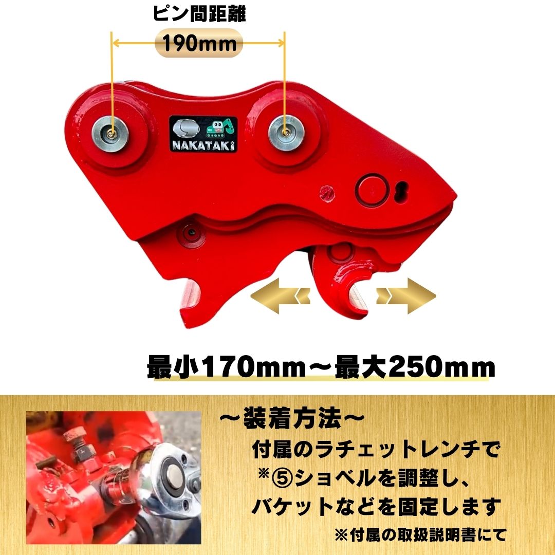 クイックヒッチは、建機用アタッチメントを迅速(クイック)に交換できる作業効率化のための強い味方! 使い方が分かる動画をご覧ください!! 新品 クイックヒッチ #65-144 商品詳細 ピン径35mm アーム幅146mm ピン間距離190mm(取付許容範囲160~220mm) 対応機種2トン〜4トンクラス 付属品バケットピン2本、ラチェットレンチ、スペーサーシム(必要な場合のみ) 備考※アーム幅は、スペーサーシムにて対応いたします ★★★必ずお読みください★★★ ※クイックヒッチと機械式フォークは一緒にはご使用になれませんので、ご注意ください。 ※クレーン仕様にはご使用になれませんので、ご注意ください。 保証内容(付属品等) 1.ピンが折れてしまった時 2.ボルトが折れてしまった時 3.ネジが折れてしまった時 4.商品に亀裂などがあった場合(小傷などは対象外) 上記の様な不具合があった場合、交換いたします ※保証期間は到着後1ヶ月以内となります ★簡易塗装仕上げのみ ★購入時のご注意事項 画像8枚目の重要なお知らせを必ずご確認ください。 ◆◆参考機種◆◆ コマツ KOMATSU: PC02-2 PC20-1 PC20-2 PC20-3 PC20-5 PC20-6 PC25-1 PC25-7 PC25R-1 PC27MR-1 PC28UU PC28UU-1 PC28UU-2 PC30-1 PC30-2 PC30-3 PC30-5 PC30-6 PC30-7 PC30MR-1 PC30MR-2 PC30MR-3 PC30MR-5 PC30MRX-3 PC30R-8 PC30UU-3 PC30UU-5 PC30UU-6 PC35MR PC35MRX PC35R-8 PC38UU-1 PC38UU-2 PC38UU-3 PC38UU-6 北越工業: AX20U-4 ※上記記載の適合機種はあくまでも参考機種になります。お客様の機種に適合しないこともありますのでご購入前にご確認ください。 ※こちらに記載のない機種(型式)については、お問い合わせください。 ------ 弊社では、NAKATAKIブランドを2020年1月に設立しました。 自社で企画開発され大手メーカーに適合する様々なアタッチメントを取り扱っております。 今後は総合商社として「豊富な商品を安く」「スピーディーな対応」と「商品開発」にも力を入れてまいります。 ------ ☆発送詳細 ★全国送料無料です★離島でもOK! ★30Kg以上の商品で個人宅の場合、最寄りの西濃運輸営業所止めとなりますので、営業所をご指定下さい。 屋号を教えて頂くことで個人宅への配送も可能です。その場合、重量物は荷降ろしの際にフォークリフトが必要となります。 ★土曜日、日曜日、祝日および弊社休業日(年末年始、GW期間等)にご注文頂いた場合は翌営業日以降の出荷となります。 ------ <領収書の発行について> 領収書は購入履歴より発行いただけます。 詳しくはこちらのヘルプページをご確認ください。 <インボイス制度について> 当店はインボイス制度に対応しております。 ■定休日:土曜日、日曜日、年末年始 ■運送業者 ヤマト運輸・西濃運輸など(ご指定は出来ません) ※発送後、「追跡番号」をご連絡させて頂きます。 ■ご返品の際は、往復の送料の他、交換手数料がかかりますのでよくご確認のうえお買い求めください。 ■ご不明な点がございましたら、ご購入前にお問い合わせください。