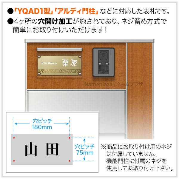 商品仕様 商品番号SIF-A-FBDG-N2サイズ幅200 × 高さ100 × 厚み6.5 mmベース素材またはカラー【前面プレート】ゴールドステンレス【背面プレート】ガラスアクリル(透明アクリル・グリーンエッジタイプ)※ベースカラーを変更すると、価格が変わる場合があります。ステンレス(シルバー) … 17,600円ゴールドステン、ブロンズステン … 18,700円文字・デザイン部ドライエッチング(着色:白)書体英数字…流隷体日本語…流隷体対応する門柱などこちらの表札は、四国化成の「アルディ門柱」「オリジナル門柱YQAD1型/YQAD2型/YQAD3型」「オリジナル門柱3型/TH3型/TH-3T型」…などにお取り付けできます。お取り付け方法機能門柱に付属のネジを使用して、ネジ留め式でお取り付けいただけます。納期レイアウト承認後10〜14営業日で発送予定納期表示は、「正式発注」が確定してからかかる日数です。オプション項目のご指定内容によっては、納期が変更になる場合があります。ゴールデンウィーク、お盆休み、年末年始などの前後は、お届け予定日が変更になる場合があります。ご注意事項掲載写真の色合いは、お使いのモニタの特性によって現物と多少異なって見える場合があります。