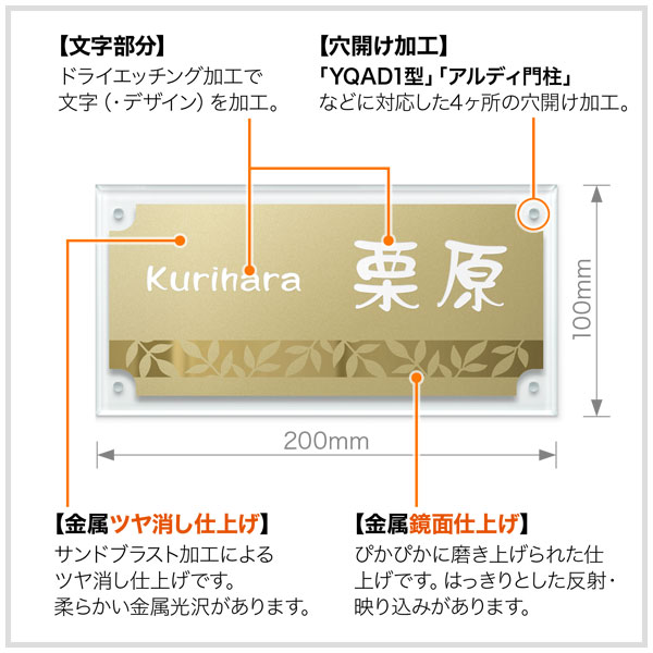 表札 四国化成 アルディ門柱/YQAD1型など対応 機能門柱用 戸建て ゴールドステンレス 透明アクリル 200×100 リーフ柄 葉っぱデザイン かっこいい おしゃれ 長方形 4点ビス止め式 SIF-A-FBDG-N2