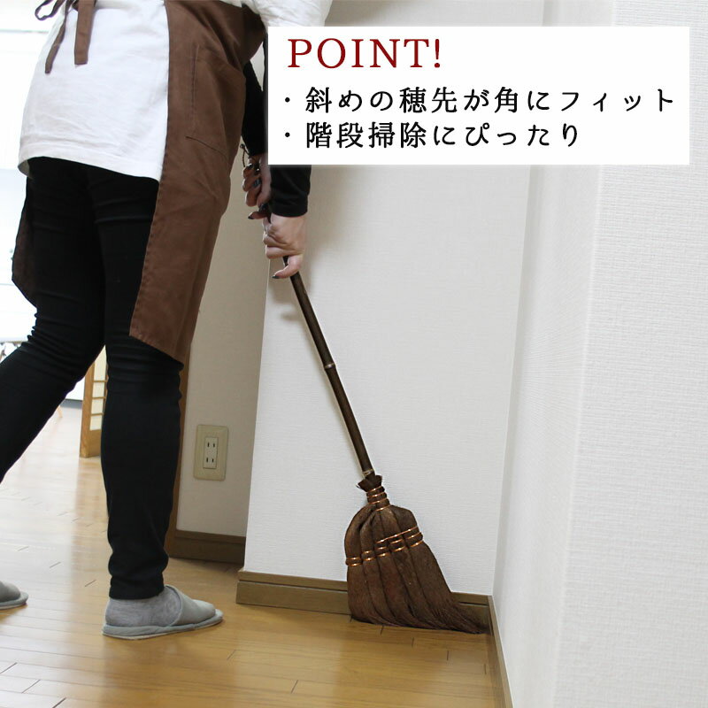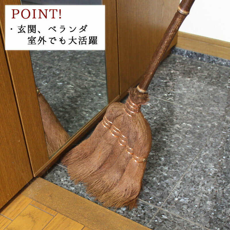 商品説明 棕櫚箒は数百年の歴史があるといわれる日本の伝統的な箒です。 棕櫚の木から剥いた棕櫚皮をそのまま丸めて束ねて、箒の穂先になるところだけをほぐした棕櫚箒は江戸時代以前から京都を中心に西日本で作られていた和帚です。 昔から広く一般家庭の室内箒(座敷箒)として畳や床に使われてき棕櫚の「皮巻箒」です。 幾層にも束ねた上質な棕櫚皮をほぐした穂先は、鬼毛箒よりも細く柔らかい棕櫚繊維の分厚い毛束になっています。 掃き心地は柔らかく、なでるように床を掃きます。 パウダー状の塵や髪の毛もよくとれます。 棕櫚箒で掃き掃除をした畳やフローリングを素足で歩くと不思議とサラリとして心地がよいです。 棕櫚箒に使われる材料の棕櫚の木は、ヤシ科の木です。 棕櫚箒の原料の棕櫚皮の繊維は、数ある天然繊維の中でもすぐれた性質があり、弾力がありしなやかです。 耐水性と耐久性に優れ、棕櫚の繊維が埃(ほこり)や毛などの細かいゴミをくっつけるため、目に見えにくい小さなホコリも舞い上がらずにとることが出来ます。 さらには、棕櫚の繊維に含まれる油分が畳・フローリングに自然な艶を出す効果があり、優れた自然素材としても有名です。 また、棕櫚箒は素材の特徴である静電気を発生させない効果があるため、穂先に絡まったホコリも簡単に落とすことができます。 棕櫚箒は置き場所をとらず、自然素材で、見た目が飾っておきたい美しさなので、いつでも手にとれる場所に吊るして置けます。 掃除機と違い電気を使わず騒音もないので、夜中の掃除や、赤ちゃんが寝ている時間、また誰かと会話している間でも埃を立てずに静かに掃除をすることが可能です。 万一の停電時の掃除にも使えるECO商品です。 玉数: 5玉 サイズ: (約)高さ95cm×幅23cm 材質: 棕櫚・銅線・竹 ご注意 最初は粉や繊維が落ちます。気になる場合は繊維をよく落としてからご使用ください。 ご覧頂いてます環境により、色の見え方が若干異なる場合がございます。 手づくり商品のため、商品により若干の個体差がございます ★様々なイベント・ギフトに 結婚祝い 出産祝い 還暦祝い 長寿祝い 古希 喜寿 傘寿 米寿 卒寿 白寿 誕生日 バースデー 入学 卒業 就職 転職 入社 退職 転勤 新居 新築 引っ越し 内祝い などの記念日や 成人祝い バレンタイン ホワイトデー こどもの日 母の日 父の日 敬老の日 ハロウィン 勤労感謝の日 いい夫婦の日 クリスマス などのイベント、記念の贈り物にオススメです。