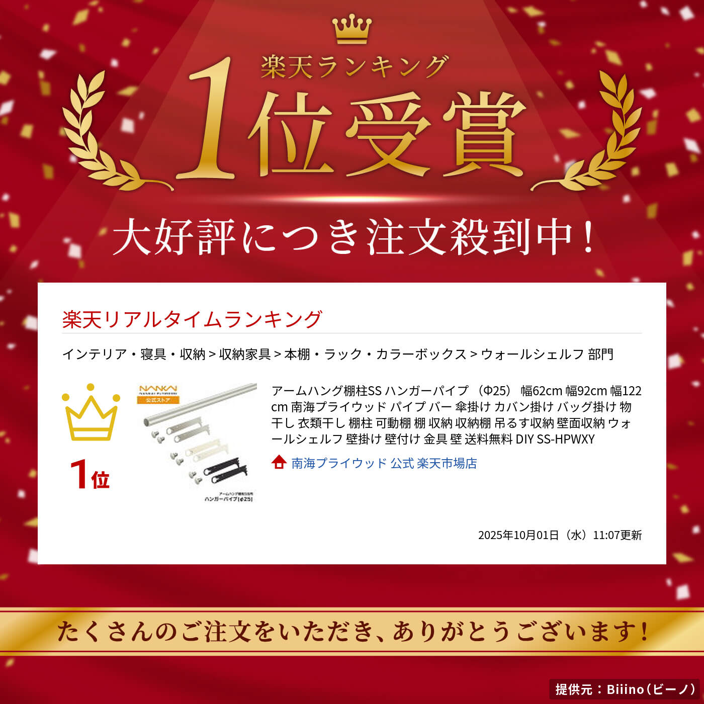 アームハング棚柱SS ハンガーパイプ (Φ25) 幅62cm 幅92cm 幅122cm 南海プライウッド パイプ バー 傘掛け カバン掛け バッグ掛け 物干し 衣類干し 棚柱 可動棚 棚 収納 収納棚 吊るす収納 壁面収納 ウォールシェルフ 壁掛け 壁付け 金具 壁 送料無料 DIY SS-HPWXY