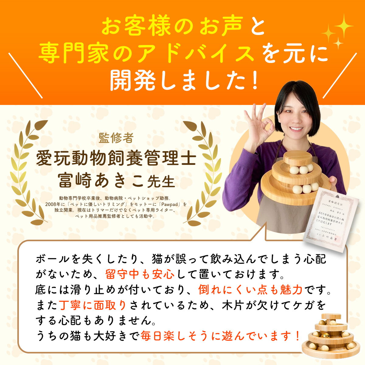 ネコちゃんにやさしい 木製ボールタワー ■猫に優しい天然竹使用 ・環境にやさしく、強度・耐久性にも優れた天然竹を使用。猫がかじっても安心です◎ ■安全設計 ・誤飲防止 …ボールが外に飛び出さない設計 ・滑り止め付き …どっしり重量感+底に付いた滑り止めでひっくり返らない ・面取り加工 …角は面取り加工されていて猫ちゃんを傷つけない ・滑らかな表面 …滑らかな表面加工で毛羽立ちやささくれの心配なし ■猫心を刺激するアイテム ・獲物を追いかけるといった猫本来の本能を刺激します。 ■上品でナチュラルなデザイン ・竹や木の素材感を活かした、落ち着いた上品なおもちゃです。 【商品仕様】 ■2段タイプ ・直径:20cm ・高さ:9cm ・重量:約750g ・木製ボール:6個 ■3段タイプ ・直径:22cm ・高さ:12cm ・重量:約1100g ・木製ボール:9個 ・鈴:1個 【関連ワード】 猫のおもちゃ ボールタワー 木 ウッド 動く 玩具 回転タワー 猫 おもちゃ ボール 木製 タワー 2段 3段 ネコ 一人遊び 知育 ストレス解消 グッズ ねこじゃらし ボール回転盤 鈴付き 木 竹製 留守番