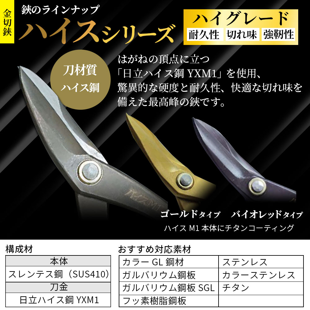 ■製品情報■ メーカー 盛光 商品名 ハイスM1シリーズ これまでの金切鋏とは明らかに違うハイスM1。はがねの頂点に立つ「日立ハイス鋼YXM1」驚異的な硬度と耐久力、快適な調子と切れ味を実現したベストシリーズの板金鋏です。
