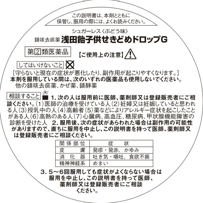 ご注文は、当ページにある質問にご回答いただき、ご購入のお手続きをお進めください。ご注文確定後、薬剤師・登録販売者がお客様の回答内容を確認し、販売できないと判断した場合は、このお薬のご注文をキャンセルさせて頂きます。あらかじめご了承ください。第1類医薬品は、薬剤師が販売し、年齢、他の医薬品の使用状況等について、薬剤師が確認をさせていただき適正に使用されると認められる場合のみ販売をいたします。 ※ご購入に際してはorder@rakuten.co.jpからのメールを受信できるよう予めご設定をお願いいたします。 【医薬品の使用期限】 使用期限半年以上の商品を販売しております 商品区分:指定第2類医薬品 【浅田飴子供せきどめドロップGぶどう味の商品詳細】 ●3種の有効成分を配合 つらいせきやたん、のどの痛みに効果をあらわすdl-メチルエフェドリン塩酸塩など3種の有効成分を配合した医薬品です。 ●シュガーレス カロリーや糖分を制限されている方でも服用でき、虫歯にもなりにくい原料を使用しています。 ●糖衣ドロップ 伝統の糖衣技術で、舐め心地の良いドロップ剤です。 【効能 効果】 せき、喘鳴(ぜーぜー、ひゅーひゅー)をともなうせき、たん、のどの炎症による声がれ・のどのあれ・のどの不快感・のどの痛み・のどのはれ 【用法 用量】 次の量を口中に含み、かまずにゆっくり溶かして服用してください。 服用間隔は2時間以上おいてください。 8-14才・・・1回量2錠、服用回数1日6回 5-7才・・・1回量1錠、服用回数1日6回 5才未満・・・服用しないこと <用法・用量に関連する注意> ・定められた用法、用量を厳守してください。 ・小児に服用させる場合には、保護者の指導監督のもとに服用させてください。 【成分・分量】 12粒中 dl-メチルエフェドリン塩酸塩・・・25mg セチルピリジニウム塩化物水和物・・・3mg クレゾールスルホン酸カリウム・・・90mg 添加物として還元水アメ、還元麦芽糖水アメ、グリセリン脂肪酸エステル、グリチルリチン酸2K、アセスルファムK、L-グルタミン酸Na、DL-リンゴ酸、アラビアゴム、カルナウバロウ、タルク、サラシミツロウ、香料含有 【注意事項】 <してはいけないこと> [守らないと現在の症状が悪化したり、副作用が起こりやすくなります。] ・本剤を服用している間は、次のいずれの医薬品も服用しないでください。 他の鎮咳去痰薬、かぜ薬、鎮静薬 <相談すること> 1.次の人は服用前に医師又は薬剤師にご相談ください。 (1)医師の治療を受けている人 (2)妊婦又は妊娠していると思われる人 (3)授乳中の人 (4)高齢者 (5)薬などによりアレルギー症状を起こしたことがある人 (6)高熱のある人 (7)心臓病、高血圧、糖尿病、甲状腺機能障害の診断を受けた人 2.服用後、次の症状があらわれた場合は副作用の可能性がありますので、直ちに服用を中止し、この説明書を持って医師、薬剤師又は登録販売者にご相談ください。 【関係部位:症状】 皮膚:発疹・発赤、かゆみ 消化器:吐き気・嘔吐、食欲不振 精神神経系:めまい 3.5-6回服用しても症状がよくならない場合は服用を中止し、この説明書を持って医師、薬剤師又は登録販売者にご相談ください。 <保管及び取扱いの注意> (1)5才未満の乳幼児の場合には、のどにつかえるおそれがありますので服用をさけてください。 (2)直射日光の当たらない湿気の少ない涼しい所にフタをしっかりしめて保管してください。 (3)小児の手の届かない所に保管してください。 (4)他の容器に入れ替えないでください(誤用の原因になったり品質が変化します)。 (5)使用期限を過ぎた製品は服用しないでください。なお、使用期限内であっても、開封後はなるべく早く服用してください。 この製品についてのお問い合わせは、お買い求めのお店又は下記にお願い申し上げます。 株式会社浅田飴 お客様相談室 東京都東村山市久米川町5-29-7 03-3953-4044(ダイヤルイン) 9:00-17:00(土、日、祝日を除く) 副作用被害救済制度 電話 0120-149-931 文責:株式会社なの花北海道 TEL:011-738-1193 発送元:なの花北海道ドラッグ