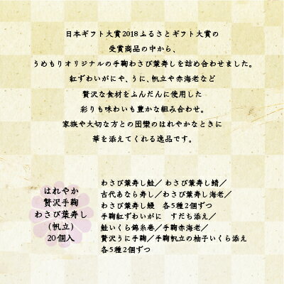 お歳暮 お年賀 ギフト 寿司【梅守本店 はれやか贅沢手鞠わさび葉寿し帆立 20個 】お取り寄せ グルメ 冷凍 手鞠寿司 人気 惣菜 プレゼント 送料無料 手まり寿司 うめもり 贈答品 お祝い お土産 奈良 一口サイズ おしゃれ かわいい パーティー