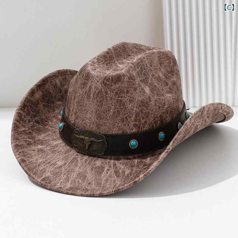 カウボーイハット 男女兼用 PUレザー フェイクレザー 牛モチーフ サファイア装飾 リベット ハットバンド つば広 ワイドブリム 通気性 日よけ UVカット パーティー イベント おしゃれ オールシーズン ブラック ブラウン カーキ