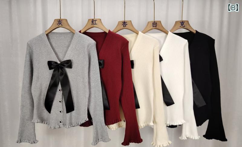 ・カテゴリ: ニットカーディガン・スタイル: カジュアル、韓国・主な素材: 安迪絨・柄: 無地・厚さ: 中厚・シルエット: スリムフィット・ネックライン: Vネック・袖丈: 長袖・要素: リボン・着丈: ショート丈・加工: パッチワーク・カラー展開: ブラック、ホワイト、アプリコット、グレー、レッド・サイズ展開: ワンサイズ・前立て: シングルボタン