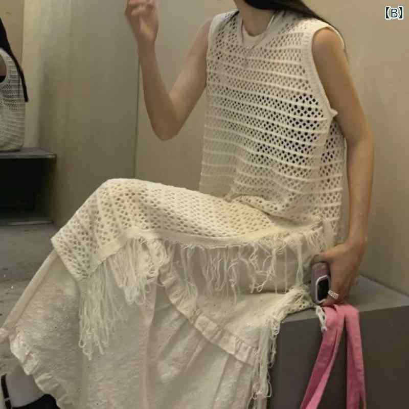 ワンピース レディース 韓国ファッション 春夏 高級感 リラックススタイル ミディ丈 スリット ラウンドネック 着回し 透かし編み フリンジ ビーチ ニット ノースリーブ ポリエステル ブルー ホワイト