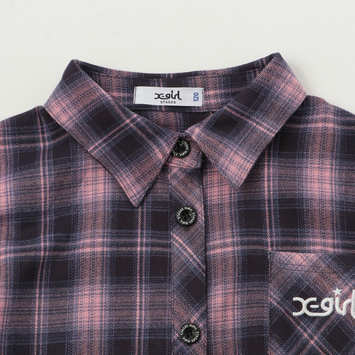 エックスガール ステージス(X-girl Stages)シャドーチェックロゴ刺しゅうロング丈シャツ