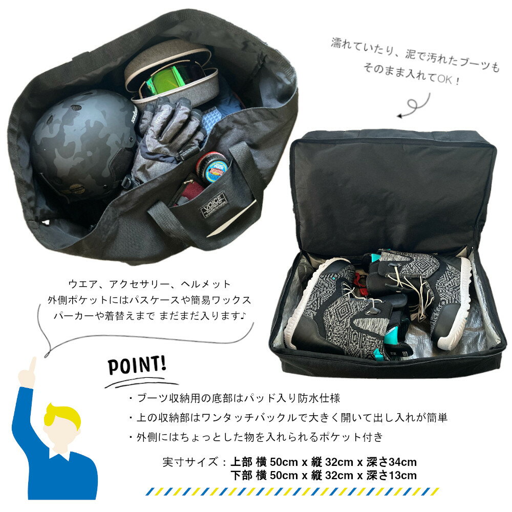ブーツを分けて収納できる、2層タイプのトートバッグ スノーボード、スキー ウィンタースポーツ用品の保管や持ち運びに。 ボード以外の必要な荷物が全部入る大容量なので、移動や着替えの時もスムーズです。 ・底部のブーツ収納部は防水仕様 ・外側にはポケット付き (約W19cmxH23cm) ・メインの収納部は大きく開いて、ウエアなど大きい荷物も出し入れが楽です ・ワンタッチバックルで荷物の量に合わせて閉められます ◆サイズ:ワンサイズ ウィンタースポーツはもちろん、夏のキャンプやプール、釣りなどのレジャーにも 用途に合わせてお使い頂けます! ・シュラフや食器、その他小物もまとめて運びたいキャンプシーン ・浮き輪やビニールシート、着替えなどをまとめて運びたいプールやビーチでのシーン ・車から長靴や、釣り道具一式入ったバッカンなどをまとめて運びたいシーン 車から荷物を運ぶ時にも大活躍です♪