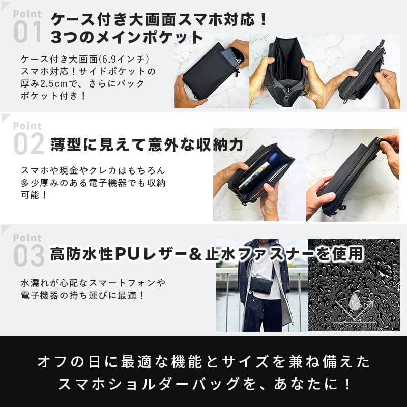 【薄マチ2.5cmなのに驚きの収納力】メンズ ショルダーバッグ 3Way スマホポーチ 見た目以上の収納力を実現した、大人の男性のための多機能バッグ このメンズ ショルダーバッグは、わずか2.5cmの薄マチでありながら、スマートフォン、ミニ財布、モバイルバッテリー、鍵、カードケースなど、日常の必需品をしっかり収納できる画期的なボディバッグです。サコッシュのような軽快さと、ガジェットポーチとしての機能性を兼ね備え、休日のカジュアルシーンからちょっとしたお出かけまで幅広く活躍します。 25回のプロトタイプ制作を経て辿り着いた、この絶妙な厚み設定。スリングバッグとしても、ミニショルダーバッグとしても使える3Wayデザインで、「見た目はスマートなのに、必要なものが全部入る」という理想を実現しました。 ■ 3つのスタイルで使い分けできる多機能デザイン 【スタイル1】スマホポーチとして ショルダーストラップを短めに調整すれば、体にフィットするスマホショルダーバッグに。斜めがけスタイルで手ぶらで行動でき、スマートフォンへのアクセスも瞬時。トラベルポーチやセキュリティポーチとしても安心です。 【スタイル2】ボディバッグとして ストラップを中間の長さに調整すれば、アクティブな動きにも対応するボディバッグスタイルに。ミニバッグとしてのコンパクトさを保ちながら、旅行バッグとしても活躍します。 【スタイル3】ショルダーバッグとして ストラップを長めに設定すれば、リラックスした雰囲気のショルダーバッグ メンズスタイルに。カジュアルバッグとしての使いやすさが際立ちます。 ■ 5つのポケットで整理整頓を実現 ・正面ポケット: カードケースやパスケースなど、頻繁に出し入れするアイテムに ・サイドメインポケット: iPhone 16 Pro Maxサイズまで対応。財布入れとしても最適 ・サイド内部ポケット×2: 左右の壁面に配置。小物整理に便利なミニポーチ機能 ・背面ポケット: スリ防止バッグとしても機能する、貴重品用セキュリティポケット 縦型ショルダーバッグの利点を活かした設計で、財布、鍵、モバイルバッテリー、イヤホン、リップクリーム、目薬まで、小物をスマートに整理できます。 ■ 安心の防水仕様で電子機器を守る 突然の雨や水しぶきから大切なスマートフォンやガジェットを守る、防水PUレザー素材を採用。撥水ファスナーとの組み合わせで、アウトドアやレジャーでも安心してご使用いただけます。ウォータープルーフバッグとしての信頼性も備えた、実用的なスマホバッグです。 ■ こんなシーンで活躍します 【旅行・お出かけ】 トラベルバッグやフライトバッグとして、機内持ち込み用のサブバッグに最適。パスポートポーチとしても活用でき、旅行用ポーチとしての機能も充実。 【ショッピング】 ショッピングバッグの代わりに。両手が空くので、商品選びもスムーズ。財布バッグとしても便利です。 【ドライブ】 運転中も邪魔にならないコンパクト設計。サービスエリアでの休憩時に貴重品だけ持って車外へ。カーバッグとしても重宝します。 【普段使い】 ちょっとしたお散歩やカフェ巡り、近所への買い物など、デイリーバッグとして毎日活躍。ミニマルバッグとしてのスマートさも魅力です。 ■ 幅広いファッションスタイルにマッチ カジュアルコーデはもちろん、ビジネスカジュアルなオフの日スタイルにも合わせやすいシンプルデザイン。ストリートファッションからキレイめコーデまで、30代・40代・50代の大人の男性にふさわしい、落ち着いた雰囲気のメンズバッグです。 ■ 商品仕様 ・サイズ: 幅13.5cm × 高さ22cm × マチ5cm(メイン収納部2.5cm) ・重量: 本体202g、ストラップ68g ・素材: 防水PUレザー、撥水ファスナー ・ポケット数: 5箇所(正面、サイドメイン、サイド内部×2、背面) ・カラー: [ブラック/ネイビー/ブラウンなど] ・対応機種: iPhone 16 Pro Max、Galaxy S24 Ultra、Google Pixel 9 Proなど大型スマートフォンまで収納可能 ■ 品質保証 製造から品質管理まで徹底した管理体制のもと、お客様に安心してお使いいただける製品をお届けします。万が一、初期不良や不具合がございましたら、お気軽にお問い合わせください。 ■ こんな方におすすめ ・薄型で軽量なショルダーバッグ メンズ 斜めがけタイプをお探しの方 ・ミニショルダーバッグ メンズとしてコンパクトに持ち歩きたい方 ・スマホポーチ メンズで収納力を重視される方 ・ボディバッグ メンズ 小さめサイズで十分な機能が欲しい方 ・サコッシュ メンズとしてカジュアルに使いたい方 ・防水バッグで大切なガジェットを守りたい方 ・3Wayバッグで多様なシーンに対応したい方 「薄いのに入る」という新しい価値を提供する、このメンズ ミニショルダーバッグ。あなたの日常に、スマートで快適な新しいスタイルをお届けします。 2
