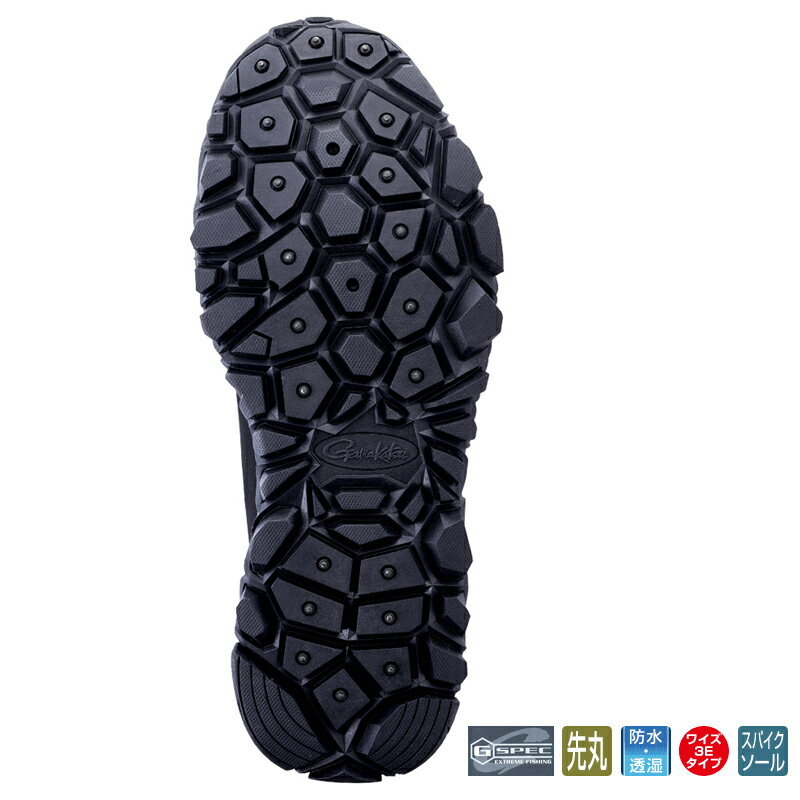 仕様/規格●本体素材:ポリエステル ラバー 合成皮革●ソール素材:ステンレス タングステン 特殊ラバー●G SPEC:耐水圧15000mm 透湿性10000g/m2・24h●※適応サイズはサイズ表一覧の画像をご覧ください。●本体には耐水圧15000mm/透湿性10000g/m2・24hを誇る透湿防水ブーティを採用した防水シューズです。●カラー:ブラック/ゴールド商品説明●驚異のグリップ力●ソールに使用しているノンスリップソールは、乾いた面はもちろん、濡れた面でもグリップ力を発揮。●素早い着脱とフィット感の調整が可能なダイヤルシステムを搭載。スピーディーなロックと解除でシューズの脱着がスムーズ。●ワイヤーによりシューズ全体を包み込むように均等に締め付け、高いフィット感を実現。釣行中に長時間着用してもワイヤーの効果で足の動きにフィットし、安定した甲部から足首までのホールド感を持続します。●ダイヤルを引き出すことで解除が簡単に可能。●従来のシューズのパターンを見直し、釣りに特化した設計を実現しました。足首をしっかりホールドすることで、磯場でのフットワーク性に優れ、疲労を軽減します。●内部と足首回りのクッション性を大幅にアップし、釣り中の足への負荷を軽減します。●シューズの横幅を3Eに設定し、日本人の足に合わせた横広設計で、着用時の安定感が向上しました。●渡船時に船上のFPR製の床で滑りやすいスパイクソールの欠点を、高い耐滑性能を持つラバー部を接地させることで克服。磯などの凸凹のあるフィールドでは、スパイク部がしっかり接地しグリップ力を発揮。商品属性●カラー:[ ブラック系 ]関連ワード●靴ジャンル識別情報:/g1043/g211/g301/m031/※納期表示のご説明はこちら