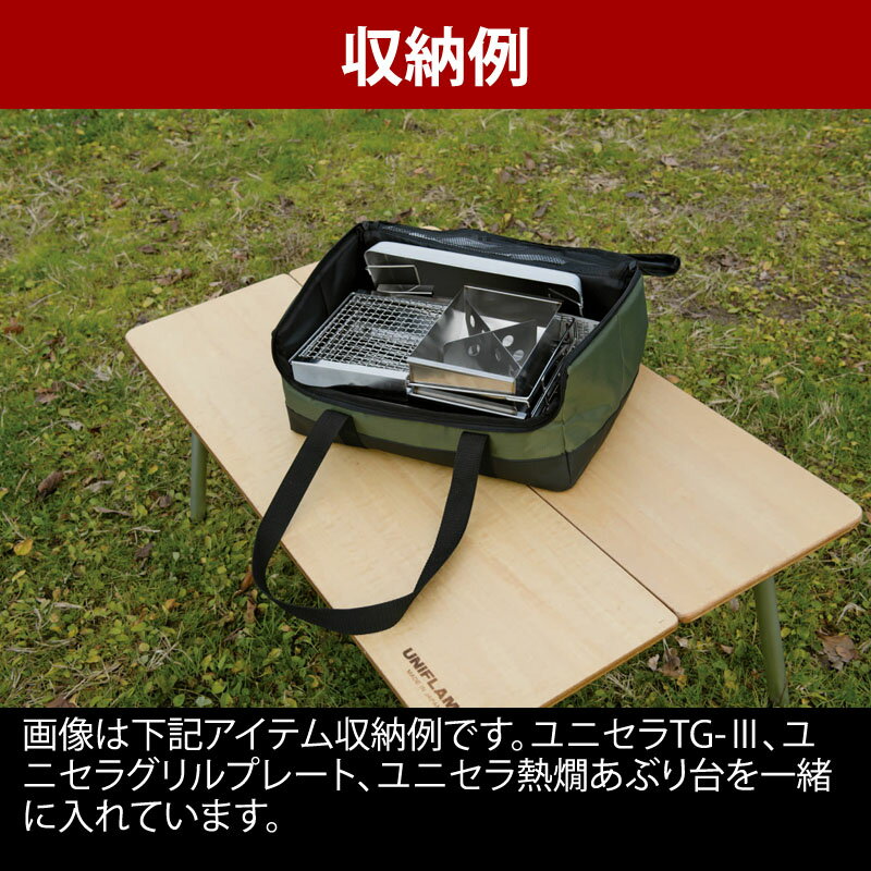 仕様/規格●材質:ポリエステル・PVC(底面)●サイズ:約375×260×180(高さ)mm●重量:約700g●生産国:中国カラーカーキグリーンメーカー品番615065商品説明●ユニセラとオプションが一緒に収納可能●ユニセラTG-III本体と、熱燗炙り台やリッド、鉄板などの周辺オプションが一緒に運べます。●底面は汚れに強いPVC加工。商品属性●カラー:[ グリーン系 ]関連ワード●キャンプ用品 ベランピング おうちキャンプ用品 調理 ソロ ユニセラ用オプション 収納ケース 収納バッグ バッグ ケースジャンル識別情報:/g1030/g205/g306/m122/※納期表示のご説明はこちら卓上グリルとして優秀なユニセラがピッタリ入り、更にオプションパーツも入る便利なケース。春夏は鉄板とリッドを持って行って贅沢に鉄板焼きをしたり秋冬は熱燗炙り台を持って行ってしっぽり楽しんだり…ユニセラの楽しみがさらに広がりそうです!