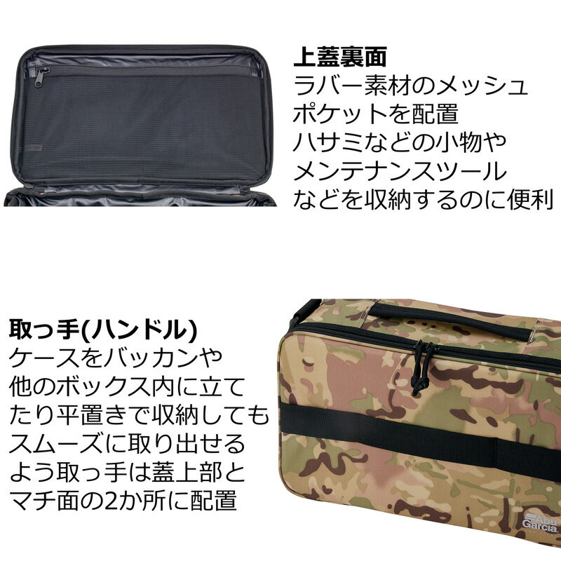 仕様/規格●本体収納部幅:35cm●本体収納部高さ:12cm●本体収納部奥行き:21cm●本体収納部容量:8L●素材:ポリエステル100%(表面PVCコーティング)●カラー:コーティングカモサイズ8Lカラーコーティングカモメーカー品番1619891商品説明●ソフトクーラーとして使用可能で、用途に応じてタックルやギアの収納などマルチユースの兼用クーラーバッグ。●食材やドリンクなどを収納するソフトクーラーとタックルやルアーケースを収納するボックスを分けておくことが可能。●1つでソフトクーラー、タックルやギア等の収納と2通りの使い方が可能なため、様々なシチュエーションで活躍。●このケースをバッカンや他のボックス等に立てたり平置きで収納しても、スムーズに取り出しやすいようハンドルは蓋上部とマチ面の2か所に配置。●ショルダーストラップ付きで肩掛けにも対応。ショルダーベルトを使用しないときは、紛失防止のため本体のループに通しておくことが可能。●本体底面には自転車等の荷台に取り付けられるベルトループを備え、上蓋内側には保冷剤などを入れられるメッシュのポケットを備えている。●ハードタイプのクーラーボックスのインナーケースとしての使用も便利。●メインとなる表生地は、強度と軽さのバランスが良い600デニールのポリエステル糸を織り上げて、表面には劣化しにくく防水性能の高いPVC加工を施している※製品は完全防水仕様ではない●内部は防水となっており氷などを入れても漏れにくい仕様。関連ワード●釣り具 釣具 つり具 持ち運び 収納ジャンル識別情報:/g1017/g201/g301/m003/※納期表示のご説明はこちら