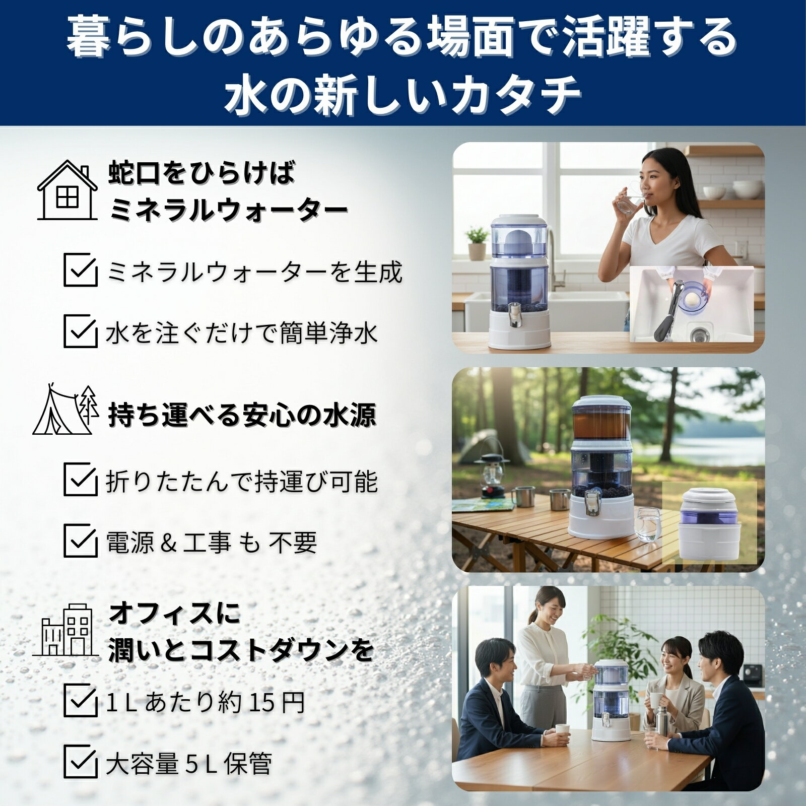 製品特徴 ●PFAS(有機フッ素化合物)除去可能 ●電源不要で水を注ぐだけで浄水可能 ●水道水から池の水まで飲料水にする ●高性能フィルターによる高い洗浄能力 ●あらゆる場面で頼れる浄水パートナー●簡単給水 ※自然水を飲用する場合は、煮沸を推奨しております。 ※海水や多量の化学物質を含んだ水は浄水できません。 性能 ●セラミックフィルター0.2マイクロメートルの小さな穴を通り、錆や土泥、微生物などの不純物をろ過 ●活性炭フィルター活性炭・ゼオライト・カオリン・珪砂が有害物質、微生物、色素、臭いを吸着ヤシ殻活性炭(ココナッツの殻)とシルバーカーボンを使用した高性能な浄水材 ●シルバーストーン・ミネラルストーン銀の力で雑菌の繁殖を防ぎ、水に40種類以上のミネラル分を付加 ●マグネットチューブ出口の腐食防止 メンテナンス方法 ●セラミックフィルター《18ヶ月ごとに交換》浄水速度の低下やセラミックフィルターに変色が見られた場合、目の粗いスポンジややすりでフィルター表面を磨く●活性炭フィルター《6ヶ月ごとに交換》 ●シルバーストーン・ミネラルストーン《18ヶ月ごとに交換》3ヶ月ごとに食塩水にて煮沸を行う 除去物質 PFAS(PFOS・PFOA)、総大腸菌群、大腸菌、糞便性大腸菌群、鉛、フッ素、ヒ素、セレン、水銀、シアン、クロム、アンモニア性窒素、硝酸性窒素、カドミニウム、ホウ素、臭素酸塩、フェノール、ダイアジノン、パラチオン、フェントロチオン、カルバリル、1.1.1-トリクロロエタン、テトラクロロエチレン(PCE)、トリクロロエチレン(TCE)、ジクロロメタン、ベンゼン、トルエン、エチルベンゼン、キシレン、1.1-ジクロロエチレン、四塩化炭素、1.2-ジブロモ-3-クロロプロパン、1.4-ジオキサン、ガラス残留塩素(遊離塩素)、総トリハロメタン(THMs)、クロロホルム、ブロモジクロロメタン、ジブロモクロロメタン、アルミニウムクロロハイドレイト、ジブロモアセトニトリル、ジグロロアセトニトリル、トリクロロアセトニトリル、ハロアセチックエシド(ハロ酢酸)、ホルムアルデヒド、硬度、過マンガン酸カリウム、匂い、味、銅、色度、洗剤(ABS)、水素イオン濃度(pH)、亜鉛、塩素イオン、蒸発残留物、鉄、マンガン、濁度、硫酸イオン、アルミニウム カートリッジ 蛇口 濾過 災害 非常用 非日常 防災 PFAS PFOS PFOA 除去 フッ素 家庭用 アウトドア サバイバル 地震 断水 電源不要 安全 高性能 キャンプ コンパクト フィルター 塩素 大容量 据置型 飲み水 節水 軟水 本体 一人暮らし 交換 ミネラル コスパ 人気 最強 雨水 井戸水 おすすめ おしゃれ 安い 万能 無し 活性炭 洗浄 消毒 お風呂 ベストセラー キッチン 天然 泥水 あくあしすてむ アクアシステム 石 農薬 大腸菌カートリッジ 蛇口 濾過 災害 非常用 非日常 防災 PFAS PFOS PFOA 除去 フッ素 家庭用 アウトドア サバイバル 地震 断水 電源不要 安全 高性能 キャンプ コンパクト フィルター 塩素 大容量 据置型 飲み水 節水 軟水 本体 一人暮らし 交換 ミネラル コスパ 人気 最強 雨水 井戸水 おすすめ おしゃれ 安い 万能 無し 活性炭 洗浄 消毒 お風呂 ベストセラー キッチン 天然 泥水 あくあしすてむ アクアシステム 石 農薬 大腸菌