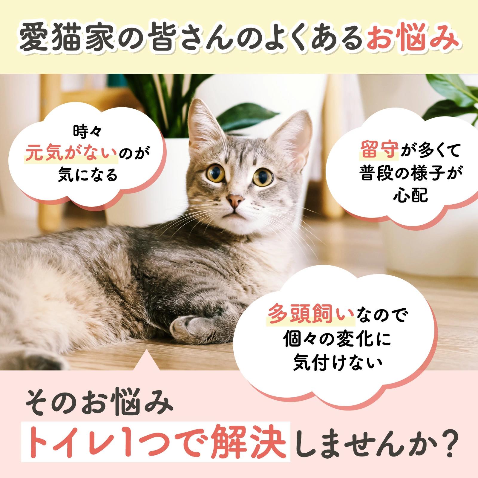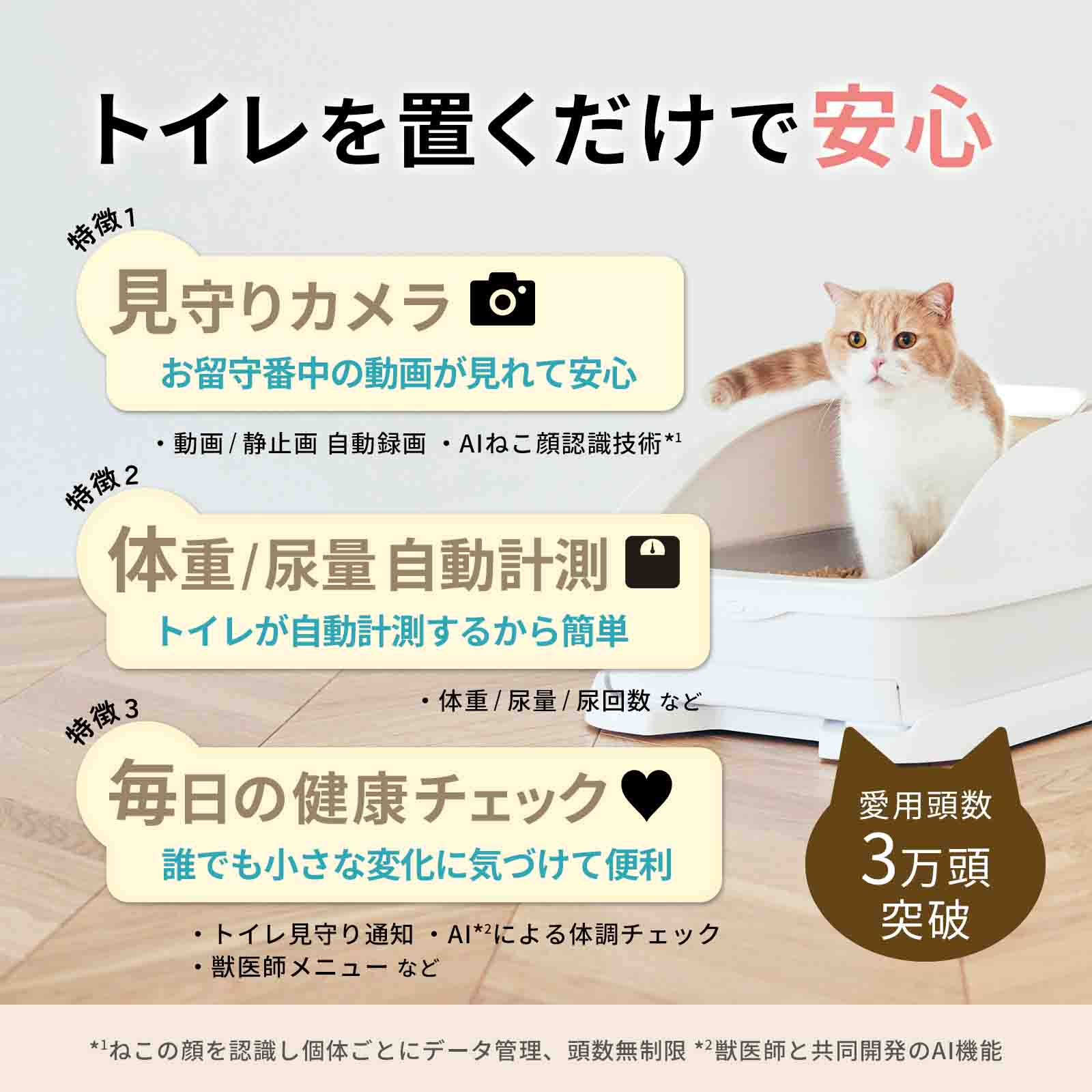 メーカー希望小売価格はメーカーサイトに基づいて掲載しています メーカー株式会社トレッタキャッツ(旧社名:ハチたま)サイズトイレの大きさ:横幅42.8cm × 奥行56.1cm × 高さ30cm ※入口の高さは約16cmとなります。 トイレの重量:約 3.3kg 測定可能なねこの体重:1~10kgこの商品について● 【月額について】一括購入プランは、月額不要、クレジットカード登録不要でご利用可能です。 ●月額プランは、一括購入プランとの併用はできません。既に「一括購入プラン」をご利用の方は「月額プラン」をご利用できませんのでご注意ください。 ● 【ねこの健康データを24時間365日、常に計測】ねこがトイレに入ると重量センサーが感知し、6つの健康指標(尿量、体重、尿回数、入室回数、滞在時間、経過時間)を自動で計測。家族が留守中や就寝中の時も、常にねこの体調を見守ります。 ● 【トイレ中を自動記録!カメラ搭載のねこトイレ。😸📲】 ねこたちがトイレをするたびに、その様子を動画と静止画で自動記録。まるで自撮りしているかのように、愛らしい姿が見られます。 ● 【顔認識カメラだから、多頭飼いでも1台でOK🐈😽】 「AIねこ顔認識技術(特許登録済み)」が搭載。カメラがねこを識別するので、1台のトイレで複数のねこの様子をチェックできます。首輪や専用のタグは一切必要ありません。 ライトがついているため、暗闇でもはっきりとした画質です。ねこがトイレに入った時に驚かぬよう、常時点灯しています。LEDの明るさは晴天時の太陽光の0.1%以下であり、健康にも問題はありません ● 【獣医師と共同開発したAIが毎日の体調をチェック】トレッタで計測した体重や尿のデータに加え、ねこのようすや食欲の記録をもとに、5,000パターン以上の中からねこの体調に合ったチェック結果と獣医師メッセージが毎日届きます。 ● 【複数端末でアカウント共有が可能】ご家族でToletta(トレッタ)のアカウントを共有することができます。 忙しい時でもご家族で大切な愛猫の見守りができます。 ● 【カレンダー・メモ機能】その日のねこのようすやうんち、与えたフードなどを写真付きで記録できます。 ● 【沢山のご要望頂いた「砂-シート」の同梱開始】 砂は 尿を吸水しにくく崩れにくいため、トレッタがより精度の高い尿量計測(95%以上の尿通過率を実現)を行えます。さらに防臭成分配合で尿の匂い成分もしっかり吸収。ねこちゃんがスムーズに使えるよう、一般的な猫砂と同じ直径4.5~6.5mmの粒サイズにリニューアル。目詰まりしにくく、トイレのお手入れも簡単です。 シートは1週間用のシートがたっぷり10枚。銅系消臭抗菌剤配合でニオイを強力消臭。ねこにとっておしっこの色は大事なチェックポイントでもある事から、色の変化がわかりやすいようにうらおもて全面白色です。仕様/スペック常時「2.4GHz帯/上り回線10Mbps以上」の安定的に通信できるWi-Fi環境が必要です。 対応電源:AC 100V アプリ対応OS:iOS/Android 利用可能地域 日本国内 ※対応するiOS・Androidのバージョンはアプリストアでご確認ください。 ※トレッタは【 IPv6通信 】には対応しておりません。IPv4環境でのご利用をお願いします。 ※ご自宅の固定Wi-Fiに「常に」接続している必要があります。 ※以下のWi-Fiはご利用いただけません ・上り回線速度が10Mbpsより遅い ・ポケットWi-Fi/フリーWi-Fi ・認証方式が「WPA-PSK」「WPA/WPA2 mixed PSK」「WEP(128/64bit)」同梱品●トイレ本体(上部カバー/スノコ/下部カバー/尿トレイ) ●センサープレート ●カメラユニット ●ACアダプター ●保護チューブ2本(ACアダプタケーブルの保護用およびセンサープレートとカメラユニットをつなぐコードの保護用) ●取扱説明書 ●保証書 ●ユーザー登録 および アプリダウンロードの案内 ●トイレ切り替えハンドブック ●トレッタオリジナルトイレ用シート「トレッタシート」1袋(10枚) ●トレッタ専用ねこ砂「トレッタサンド」1袋(4L) ※スコップは同梱しておりません。保証について●安心の1年間製品保証 正常な使用状態において、製造上の責任による欠陥があった場合、保証期間中(トレッタのお届け日より1年間)無償交換します。 ただし、正常な使用状態でない場合は無償交換の対象外となります。 ●猫ちゃんのトイレ切替がご不安な飼い主さまへ 商品のお届けから30日間ねこちゃんがトイレを使わなかった場合、初期費用(商品代金のみ)を全額保証します。 ねこちゃんは、急な環境変化でストレスを感じてしまう場合があります。ねこちゃんのペースに合わせて30日間お使いください。 ●返金保証の条件 ・初めてToletta(トレッタ)をご購入いただいた方※初回申込時に複数台購入された方は、購入台数分が返金保証の対象となります。 ・届いた商品を開封し、Toletta(トレッタ)とご自宅のWi-Fiを接続された上で、ご利用をお試しいただいた方 ※未使用未開封の場合、対象外となります ・返金保証期間(商品ご購入からから30日間)以内のお申し込みであることキャンセル・返品について●キャン
