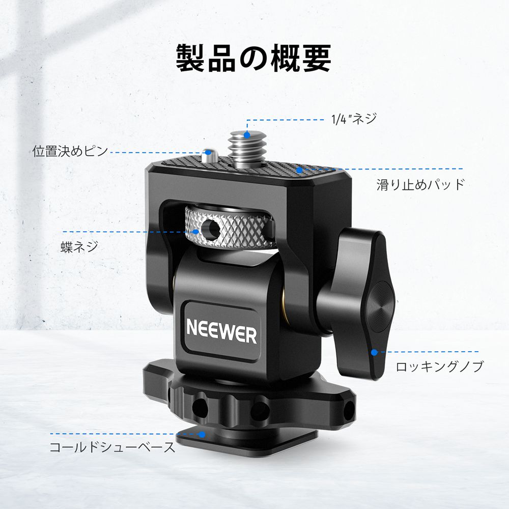 *商品説明: 【5"~7"カメラモニターマウント】 ●このフィールドモニターマウントは、ブログ、映画製作、写真撮影用の5"~7"カメラフィールドモニターを保持するように設計されて、コールドシュー付きで、SmallRigNEEWERカメラケージ、カメラビデオリグ、カメラトップハンドル/サイドハンドル、ジンバルスリングハンドルおよびカメラホットシューに対応します。 ●つまみネジは手で締められるので、取り付けも簡単です。 【ユニバーサル1/4"取り付けネジ】 ●1/4"の取り付けネジは、一致するネジを備えた5"~7"のフィールドモニターを取り付けることができます。 ●つまみネジで簡単に取り付けられ、付属のL字型六角キーを使ってスロットでつまみネジを締め直します。 【格納式アンチツイスト位置決めピン】 ●格納式のねじれ防止位置決めピンは、ATOMOS Ninja V、Ninja V+、および位置合わせ穴の有無にかかわらずその他のモニター(NEEWER F100/F200など)に対応します。 ●滑り止めのゴムパッドにより安定性が向上し、傷を防ぎます。 【調整可能な180°傾斜軸ダンピング】 ●このモニターホルダーは、180°傾斜軸によるカスタマイズ可能なダンピングを提供し、さまざまなデバイスの重量や傾斜角度に合わせて正確に調整できます。 ●サイドチルトロックつまみネジにより、工具を使わずに迅速な手動調整が可能になり、360° 回転機能により柔軟な位置決めが可能になります。 【さまざまな角度でより大きな耐荷重】 ●さまざまな角度での耐荷重が向上し、30°の傾斜で最大10.4lb/4.7kg、45°の傾斜で最大7.3lb/3.3kgをサポートします。 ●重いデバイスを扱う場合でも、特殊な角度で作業する場合でも、このマウントはすべてに対応できます。 【NEEWERからさらに発見】 ●その他のおすすめアイテム:CA016ユニバーサルカメラケージスタビライザー、CA007カメラトップハンドル、CA008 QR NATOクランプ付きトップハンドルカメラグリップ、F100/F400プロ/F500カメラフィールドモニターUA003/UA007/UA022ミニNATOレール ◆◆◆【安心のメーカー1年保証】 ●通常使用による故障が発生した場合、お買い上げ日から1年間の無償保証サービスを提供致します。 *仕様: モデル: MA006 材質:アルミニウム合金 寸法: 2.1" x 1.8" x 1"/54 x 45 x 26mm 重量: 2.2oz/62g *パッケージ内容: 1個セット: 1×モニターマウント 1×L型六角キー 2個セット: 2×モニターマウント 2×L型六角キー