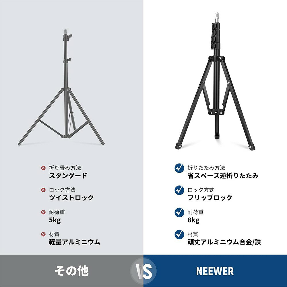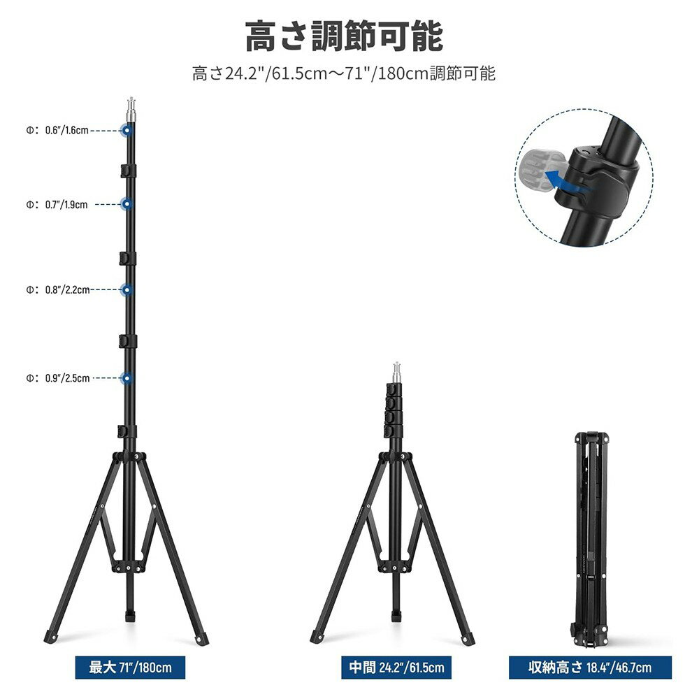 【P10倍+20%OFF券】NEEWER 180cmライトスタンド ポータブル LEDライト/リングライト/レフ板スタンド用 調整可能 金属製 カメラ三脚 逆折りたたみ三脚 フリップロック付き 生放送/Vlog/ビデオ/YouTubeに適用 ST180R