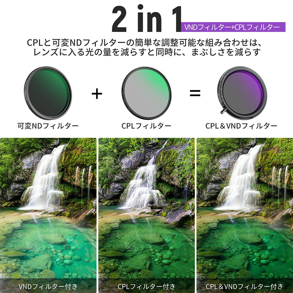 *商品説明: 【2in1可変ND&CPLフィルター】 ●NEEWER トゥルーカラー可変ND2-ND32 & CPL フィルターはNDフィルターとCPLフィルターの機能を組み合わせ、複数のフィルターの持ち運びや切り替えを避けたい写真家に便利で汎用性の高いソリューションを提供します。 ●混合フィルターは37~82mmカメラレンズに最適で、ご注文の前に、カメラレンズネジサイズ (「Φ」記号でマーク) を確認してください。 ●ご注意:ハンドノブが内蔵されているため、レンズフードには対応していません。 【可変NDフィルターによる正確な露出制御】 ●限定可変カメラレンズフィルターは、ハンドノブを緩めてフィルターを回転させることにより、ND2、ND4、ND8、ND16、ND32(1〜5ストップ)の範囲で露出を調整し、カメラセンサーに入る光の量を正確に制御できます。 ●ご注意:可変NDフィルターと特定のレンズと焦点距離との相互作用により、最大絞りを使用すると、ブラッククロスが発生する可能性があります。 【コントラスト強化&反射なし】 ●片手で調整できます。 ●ハンドノブをロックし、フィルターを回転させるとCPLフィルターに切り替わります。 ●お好みのNDストップに調整できるだけでなく、水、ガラス、葉、その他の非金属表面からのグレアや反射を低減できます。 ●回転させることで、より詳細で彩度の高いクリアな画像を正確に制御できます。 【忠実な色再現】 ●調整可能な2in1フィルターは、トゥルーカラー効果を実現し、忠実な色を再現し、色補正のための後処理ではなく、制作により多くの時間を費やすことができます。 【マルチコート光学ガラスと超薄型フレーム】 ●フィルターの高精細光学ガラスは、多層コーティングにより、グレアと反射を低減し、水、ほこり、油、指紋、傷から保護できます。 ●軽量で精密なCNC加工アルミニウム合金フレームは、フィルター取り付けが簡単なぴったりフィットと安全なグリップを確保し、圧倒的な2in1汎用性で高い携帯性を実現します。 ◆◆◆【安心のメーカー1年保証】 ●通常使用による故障が発生した場合、お買い上げ日から1年間の無償保証サービスを提供致します。 *仕様: モデル:NW シリーズ S アイテムタイプ:カメラレンズフィルター 互換性:37~82mmカメラ レンズ 用途:写真&ビデオ 主な特徴:2in1/トゥルーカラー/調整可能 取り付けポイント:ネジ 主な材質:光学ガラス/アルミニウム合金 フィルタータイプ:可変ND/CPL HD光学ガラス:はい *パッケージ内容: 1×2in1可変的な ND&CPL フィルター 1×フィルターケース 1×クリーニングクロス