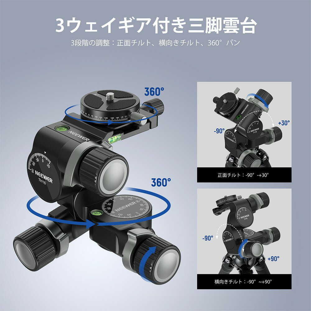 NEEWER 3ウェイ ギア式三脚雲台 3軸パンチルトヘッド ミリ単位微調整 360°パノラマ Arca型QRプレート付き アルミ合金製 クイックスイッチ付きラージ&ファインデュアルモード 最大荷重6kg TH16