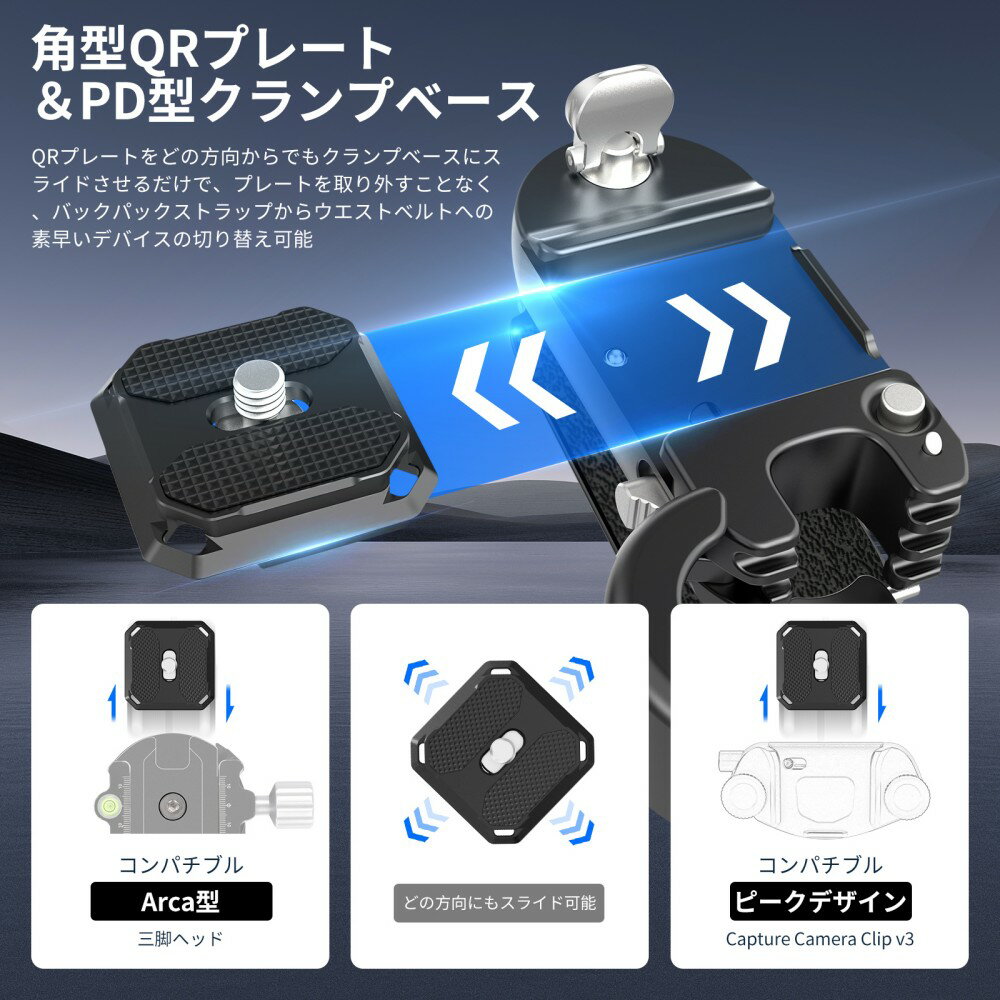 【P10倍+5%OFF券】NEEWER バックパックカメラクリップマウント カメラホルスター 角型QRプレート/アップグレード安全ラッチ クイックリリース カメラベルトクリップ バックパックストラップマウント クランプホルダー Peak Design PD用 QRシステム DSLRカメラ GP67