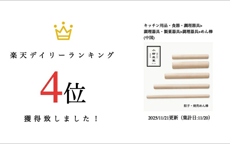 商品についてのお問い合わせはお電話でも受け付けております。 商品説明 5種類(A〜E)を一気に、そしてお得にそろえることができます。 餃子や焼売の生地作りにかかせない麺棒です。 ブナ材で作られております。 ぜひお使いください(^^♪ 商品情報 ブランド 小柳産業 生産地 日本 サイズ 短めの餃子・焼売 めん棒サイズ一覧表 A 2Φ×14.5cm B 2.8Φ×14.3cm 長めの餃子・焼売 めん棒サイズ一覧表 C 2.4Φ×18cm D 2Φ×22.5cm E 1.4Φ×25.5cm 配送・ギフト ネコポス 可 ギフト包装 ラッピング / ギフトカード / 熨斗 よく利用されるシーン 内祝い/結婚祝い/退職祝い/結婚記念日/誕生祝い/銀婚式/金婚式/結婚式お返し/出産祝い/お祝い返し/お返し/お祝い/入学祝い/就職祝い/還暦祝い/御祝/お礼/プレゼント/誕生日/贈り物/ギフト/引越し祝い/新築祝い/開店祝い/記念日/還暦/古希/喜寿/傘寿/米寿/卒寿/白寿/お中元/御歳暮/2次会/忘年会/家族/母の日/お母さん/父の日/お父さん/敬老の日/新年の挨拶/バレンタイン/ホワイトデー/クリスマス/10周年/100周年/周年祭/お土産/粗品/学校設立/法人設立/上場記念/周年祭/設立記念/独立記念/引き出物/ノベルティ/法人/企業/コンペ/上司/社長/年上/20代/30代/40代/50代/60代/70代/80代/90代/日本/伝統工芸/伝統文化/和風/和/モダン/北欧/シンプル 関連商品天然木の回転めん棒 | 小柳産業 | 麺棒 天然 木製 日本製 小 大...炭化竹ターナー | 小柳産業 | ターナー 炭化竹 竹製 返し 穴明き...炭化竹ターナー | 小柳産業 | 炭化竹 ターナー 竹製 天然 大 小...440円385円385円昭和の台所ピーラー | 小柳産業 | ピーラー 日本製 燕三条 木製 ...木の千切りピーラー | 小柳産業 | ピーラー 千切り 木製 燕三条 ...木の薬味おろし | 小柳産業 | おろし器 日本製 燕三条 木製 ステ...1,980円1,980円1,760円ヒノキのターナー | 小柳産業 | 桧 ターナー 日本製 木製 穴明き...木の千切りスライス | 小柳産業 | スライサー 千切り 木製 燕三条...木の輪切りスライス | 小柳産業 | スライサー 輪切り 木製 燕三条...715円1,650円1,540円天然木トング | 小柳産業 | ブナ トング 大 小 調理器具 キッチ...天然木ターナー | 小柳産業 | ターナー ブナ 木製 天然 穴明き ...ヒノキのしゃもじ | 小柳産業 | 桧 しゃもじ 小 中 日本製 木製...1,870円880円418円
