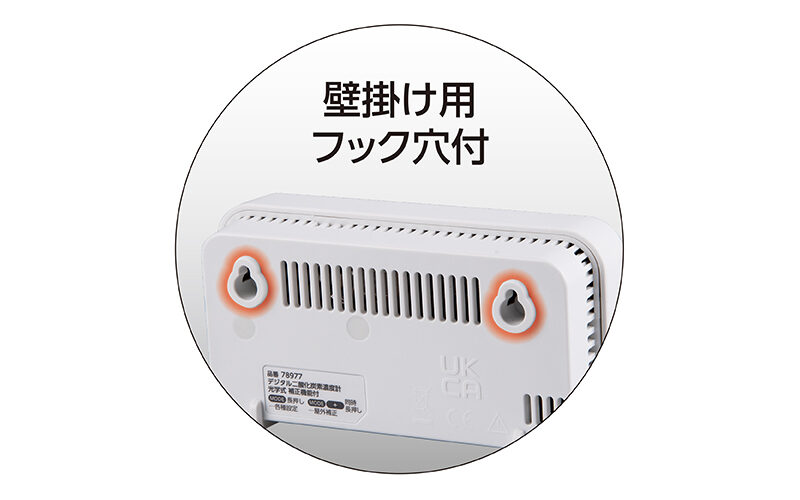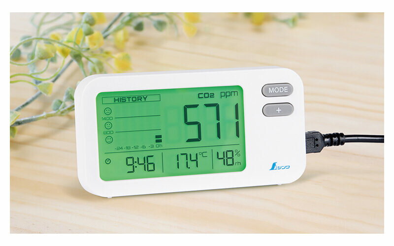 ■特長 ・二酸化炭素濃度を、液晶ディスプレイの表示カラーと数値でお知らせします。 ・1日の二酸化炭素濃度変化をグラフで表示することができます。 ・二酸化炭素濃度・時刻・温度・湿度・二酸化炭素濃度グラフを同時に表示できます。 ・二酸化炭素以外のガスなどに反応しない光学式センサーを採用しました。 ・精度に不安を感じたらすぐに直せる補正機能付です。 ・そのまま置いても、フック穴で壁掛けもできます。 ・好みで7色から選べるバックライト機能付です。 ■仕様 二酸化炭素濃度 測定範囲:0~9,999ppm 精度: 〔0~3,000ppm:±100ppm または±7%のいずれか大きい方〕 〔3,000ppm以上:±10%〕 温度 測定範囲:0~50℃ 最小表示(分解能):0.1℃ 精度:±1℃ 湿度 測定範囲:0~99% 最小表示(分解能):1% 精度※: 〔20~80%:±5%〕 〔その他:±10%〕 使用温湿度 0~50℃、0~95%(結露がない時:0~99%) 測定間隔 2秒(液晶表示間隔:30秒) 電源 USB DC 5V 300mA以上 材質 本体:ABS樹脂 本体サイズ 55×105×33mm 製品質量 86g 付属品 USB(Type-A - micro Type-B)ケーブル ※使用温度が25℃の場合