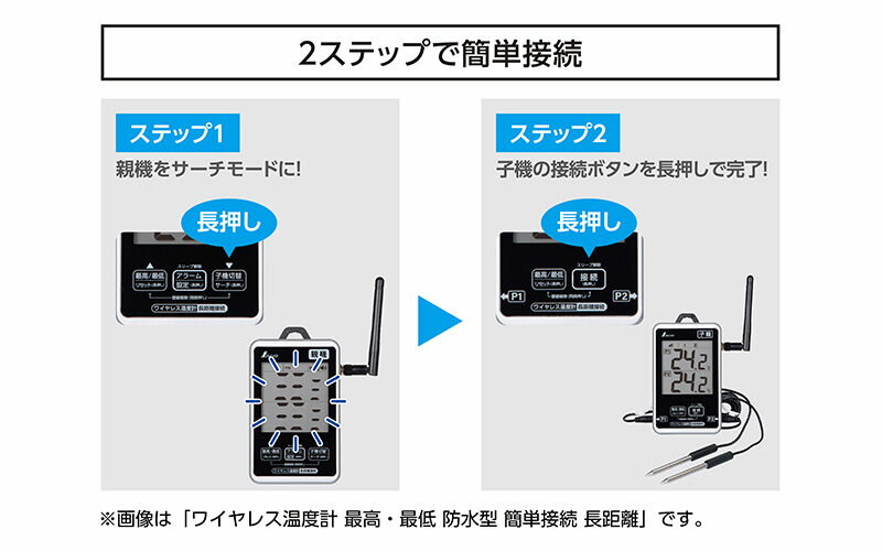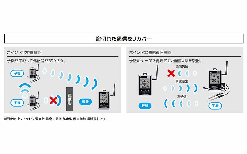 ●特徴 ●離れた場所にある子機の温度を親機で受信し、確認ができます。 ●親機、子機共に温度測定ができます。また、子機はプローブ状の温度センサーを2本搭載しているので、離れた2か所の温度を測定することができます。 ●子機の中継機能により、中継できる位置に子機を設置することで、電波が直接届きにくい位置にある子機の電波を中継して親機へ届けることができます。 ●より受信しやすい位置を判断して設置しやすい受信強度表示付です。 ●親機と子機を2ステップで簡単に接続できます。子機は最大5台、親機は3台まで接続可能です。 ●製品本体は防塵・防水性能IP64、温度センサーは防水性能IPX7です。 ●親機でそれぞれの子機、それぞれのプローブごとに個別のアラーム設定ができます。 ●最高温度、最低温度測定機能付です。子機で確認でき、親機からでも各子機の最高温度、最低温度の確認とリセットを行うことができます。 ●電池の消耗状態が分かる電池消耗表示付です。また、親機から子機の電池の消耗状態を確認することもできます。 ●背面にはスタンドが付いているので立てて置くことができます。 ●USB Type-Cから電源を供給して動作させることができます。